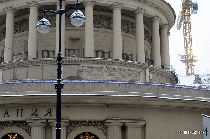 Я в июне 2004 фотографировал это место крупным планом с той же самой точки. Тогда штукатурка была на месте, но трещины уже были. Ещё одно отличие: раньше крепление подвески контактной сети было несколько ниже, точно там, где на твоём снимке штукатурка отсутствует. Подвеска может давать высокую нагрузку на стены, к которым она крепится. Может быть, она и вырвала этот кусок?