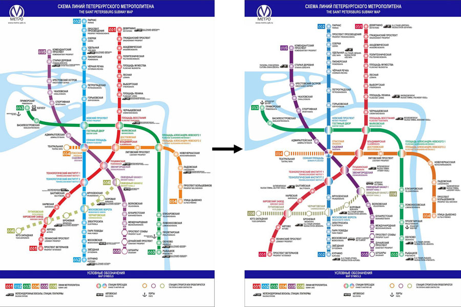 - разные расстояния между станциями и их названиями (ПлАН - слишком близко к М3, Адмиралтейская улетела слишком далеко влево, а Фрунзенская вверх)