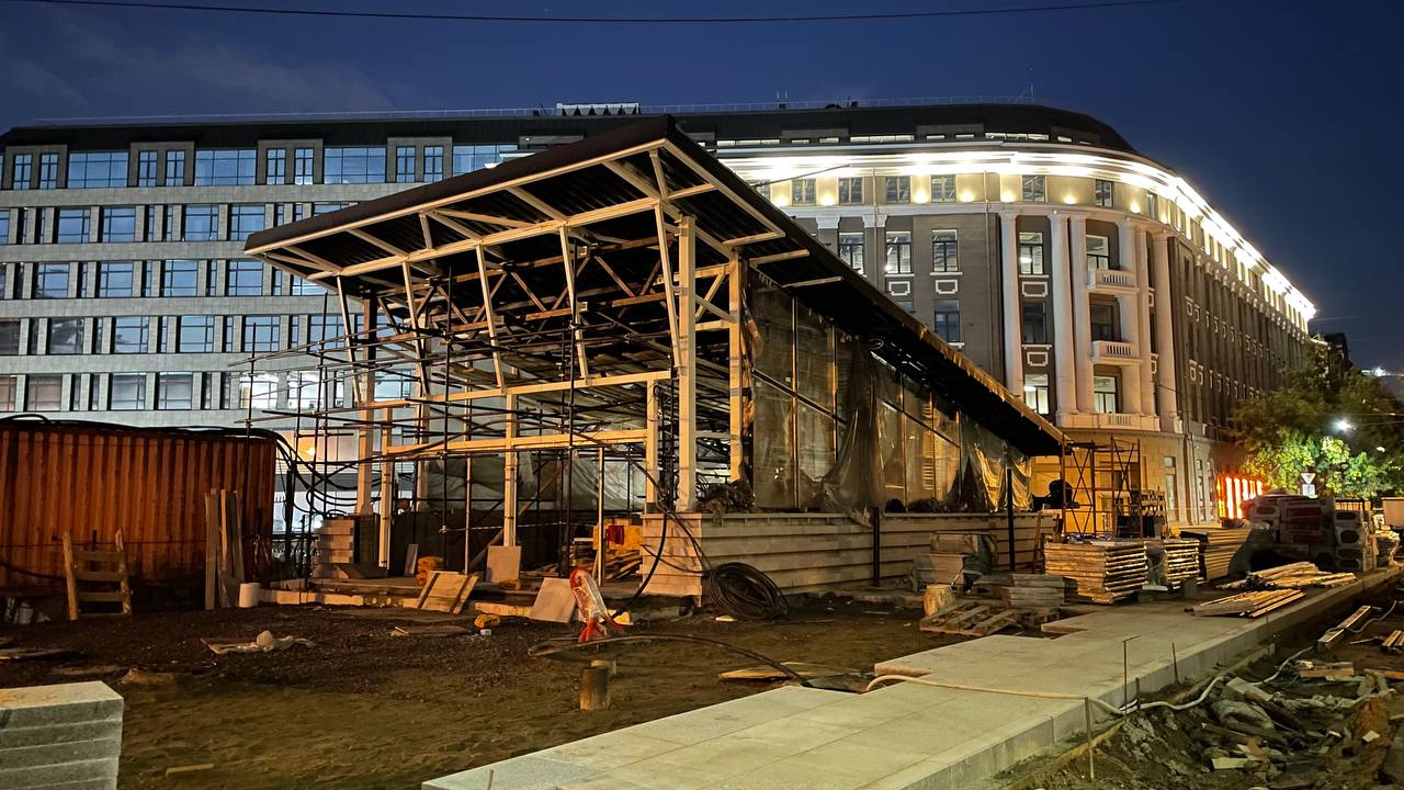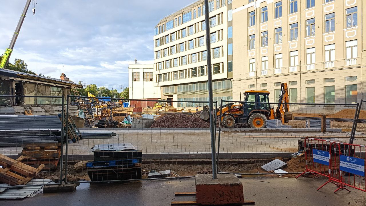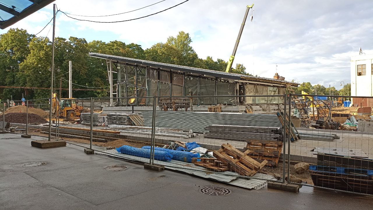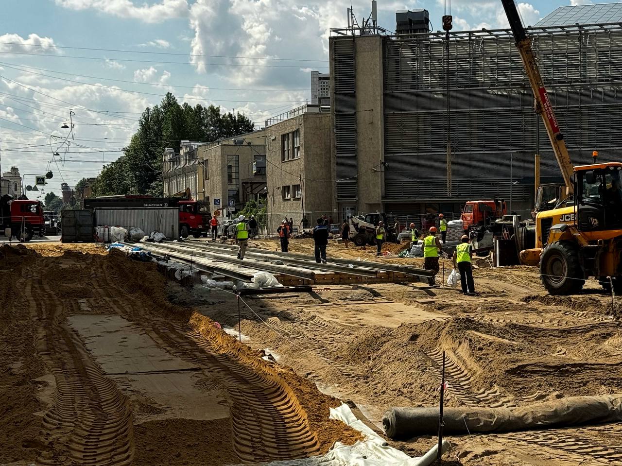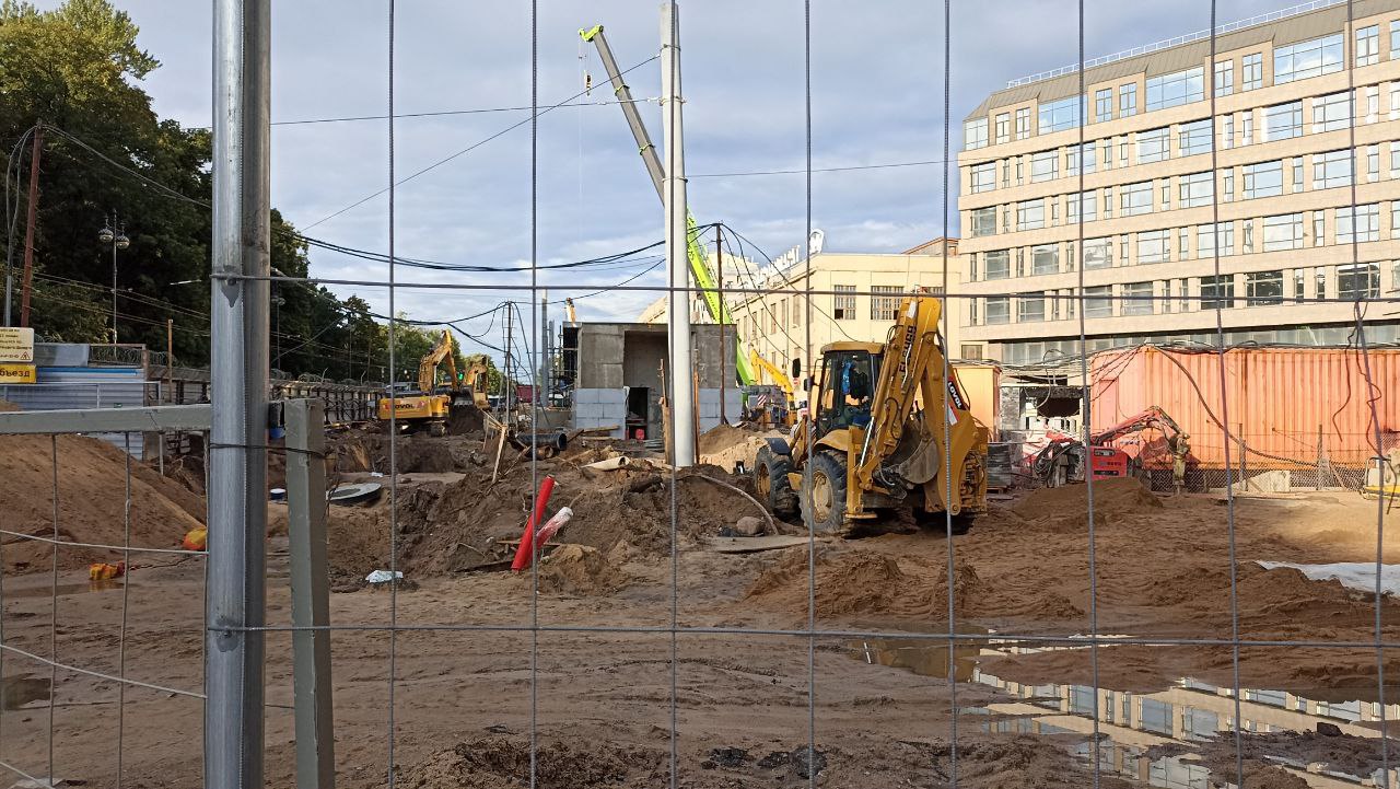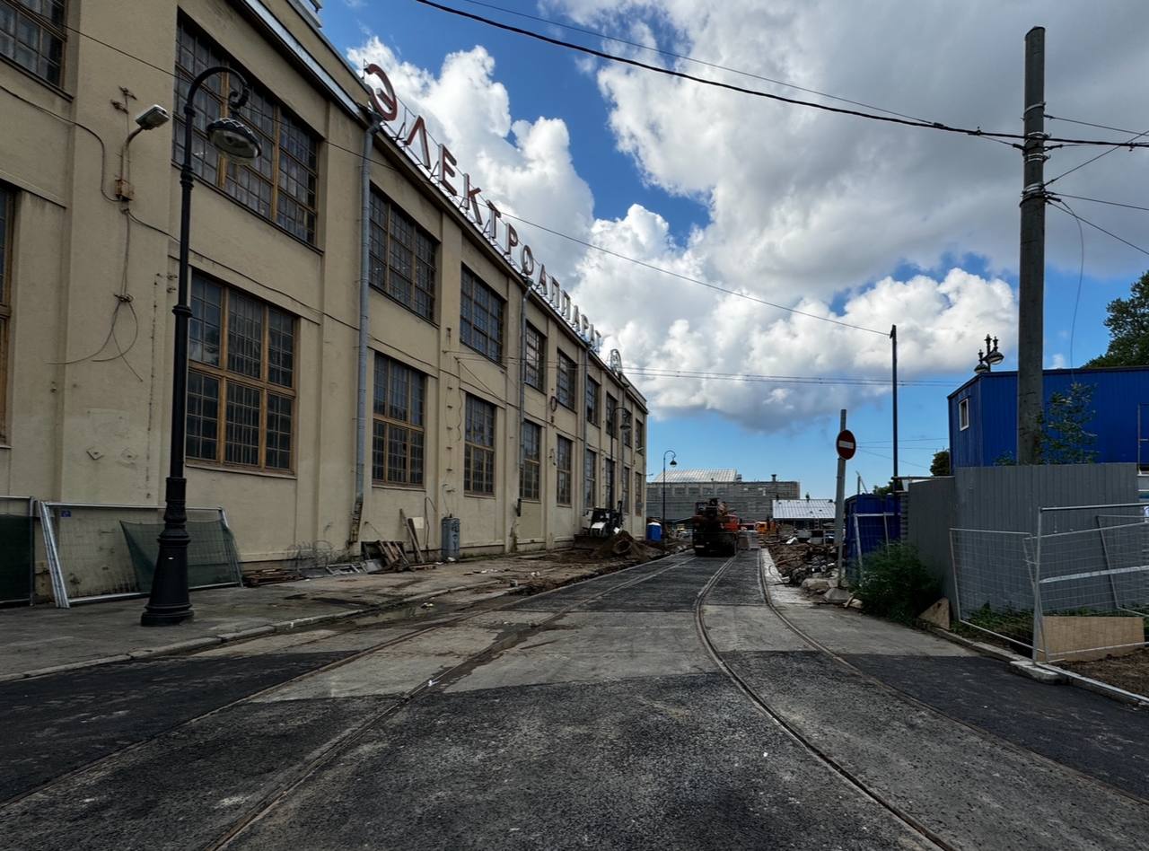 На Васильевском острове Санкт-Петербурга, вблизи строящегося вестибюля станции «Горный институт» Лахтинско-Правобережной (четвёртой, оранжевой) линии Петербургского метрополитена, идут работы по восстановлению трамвайного пути вдоль Косой линии.