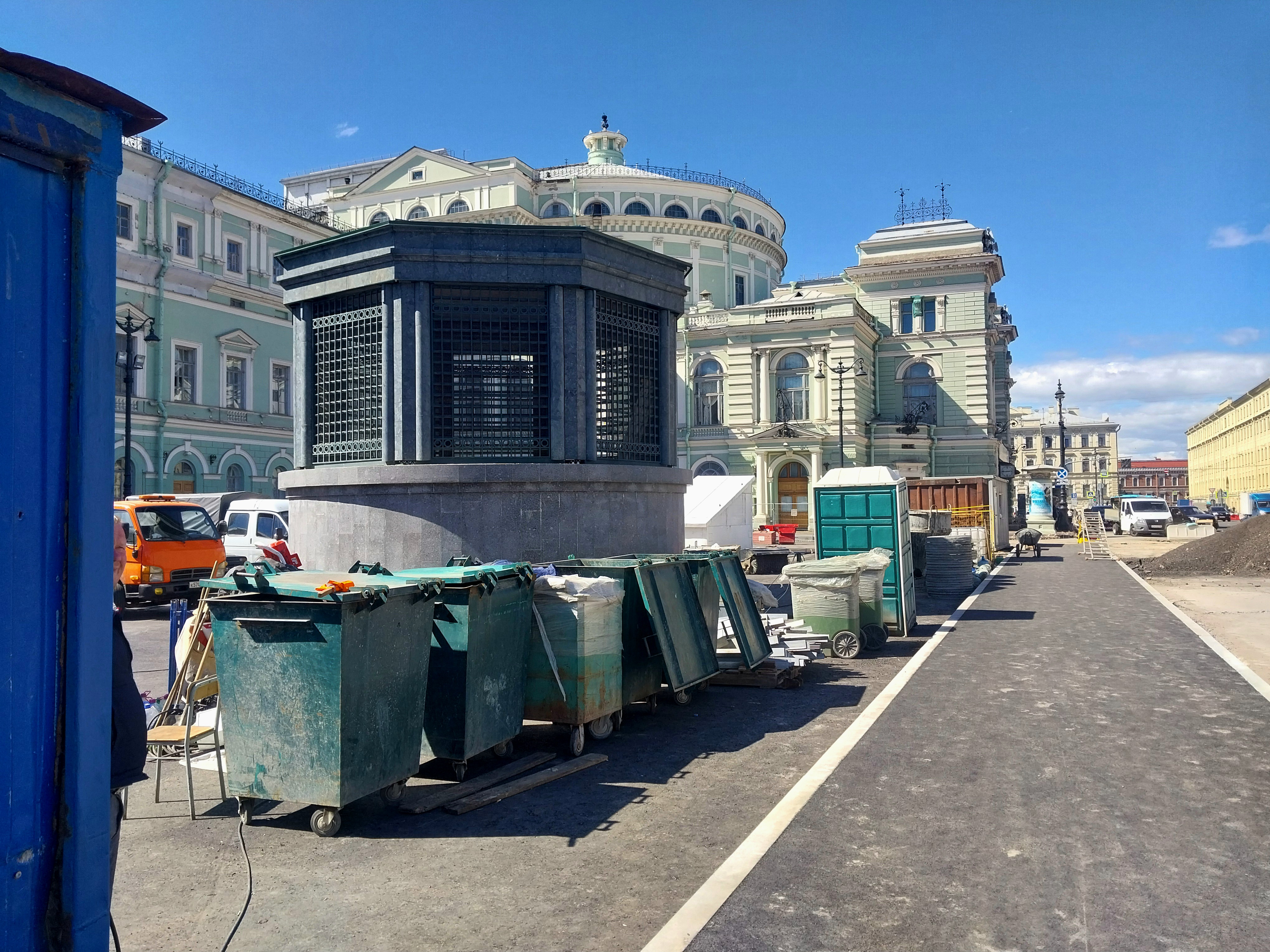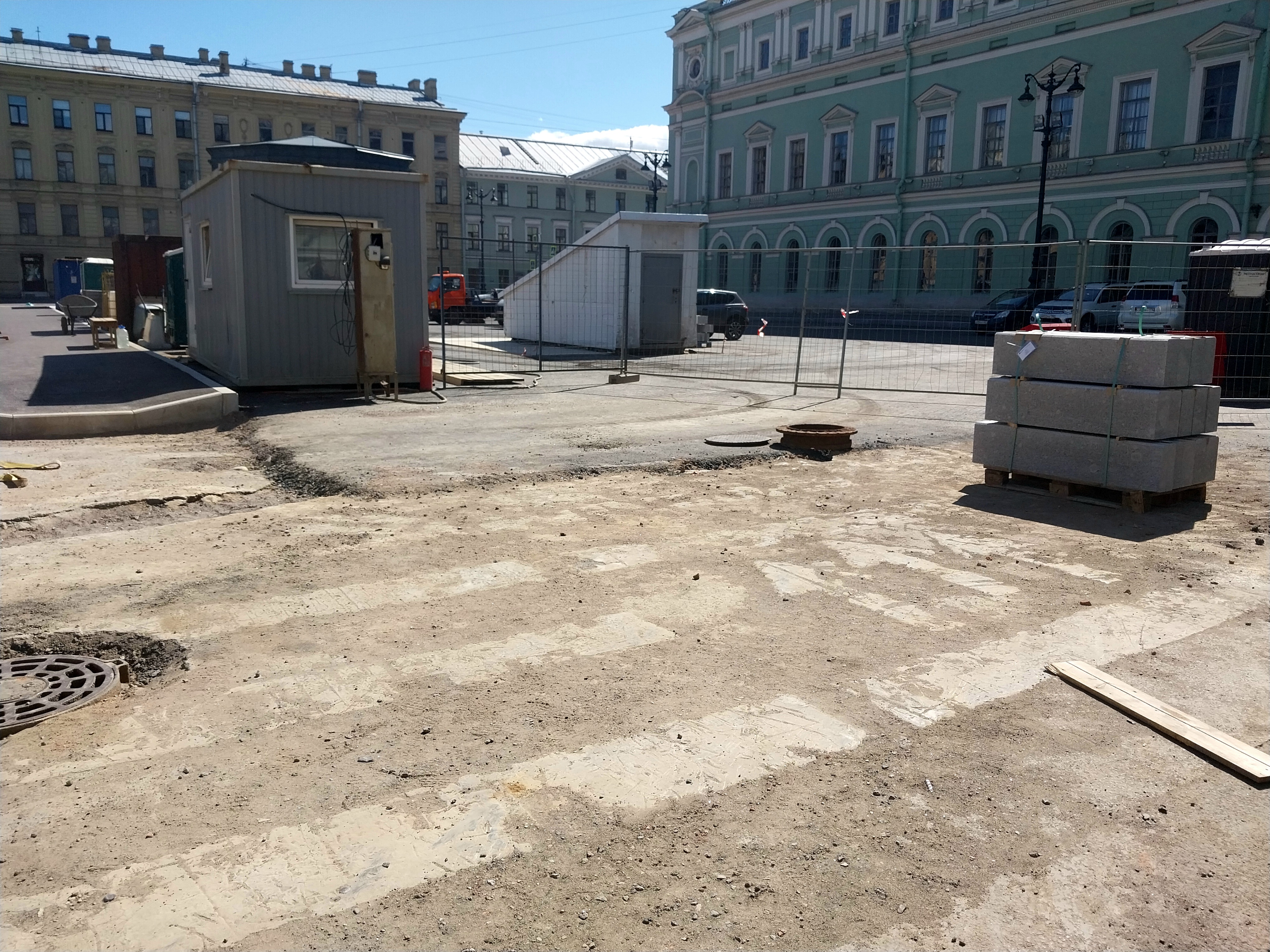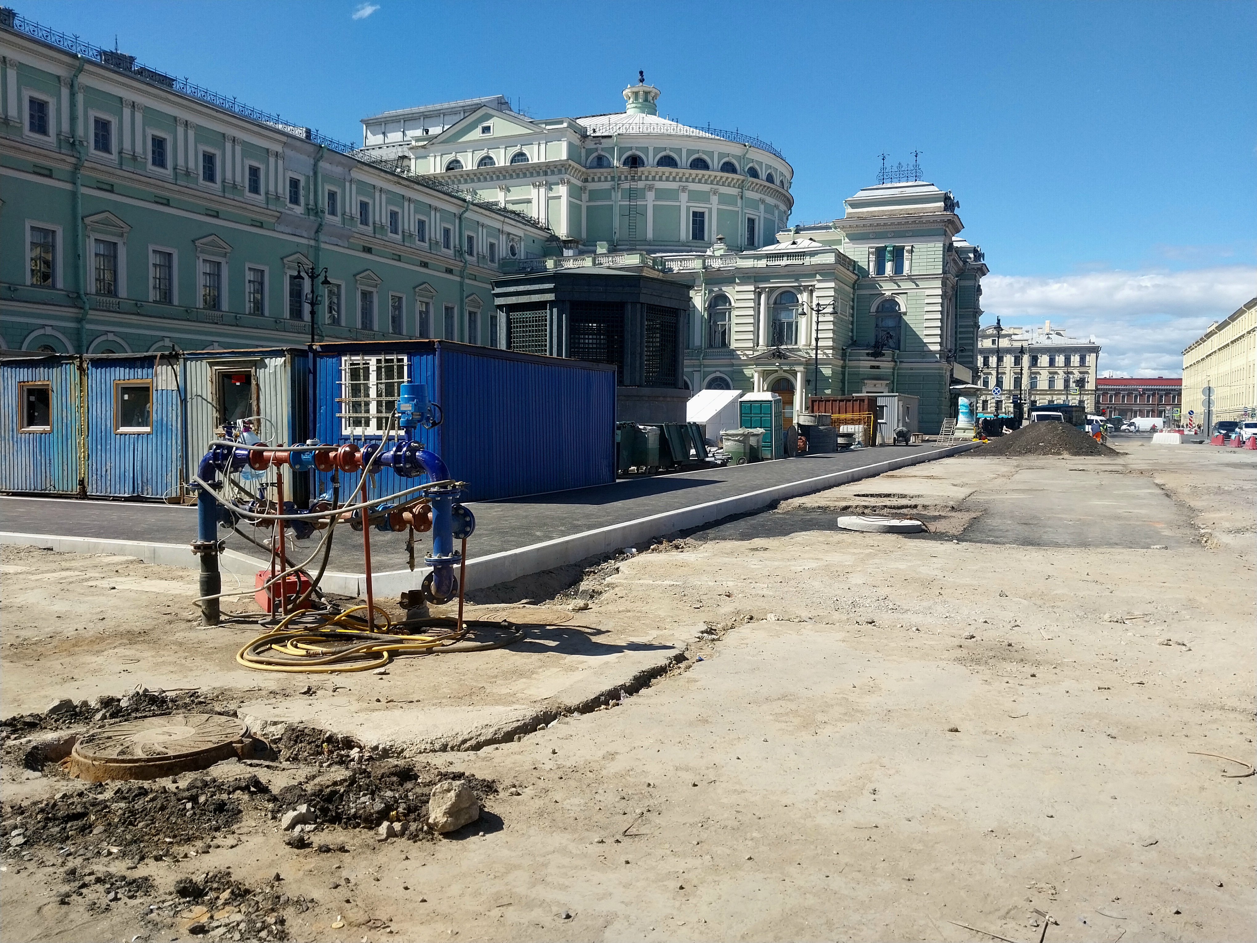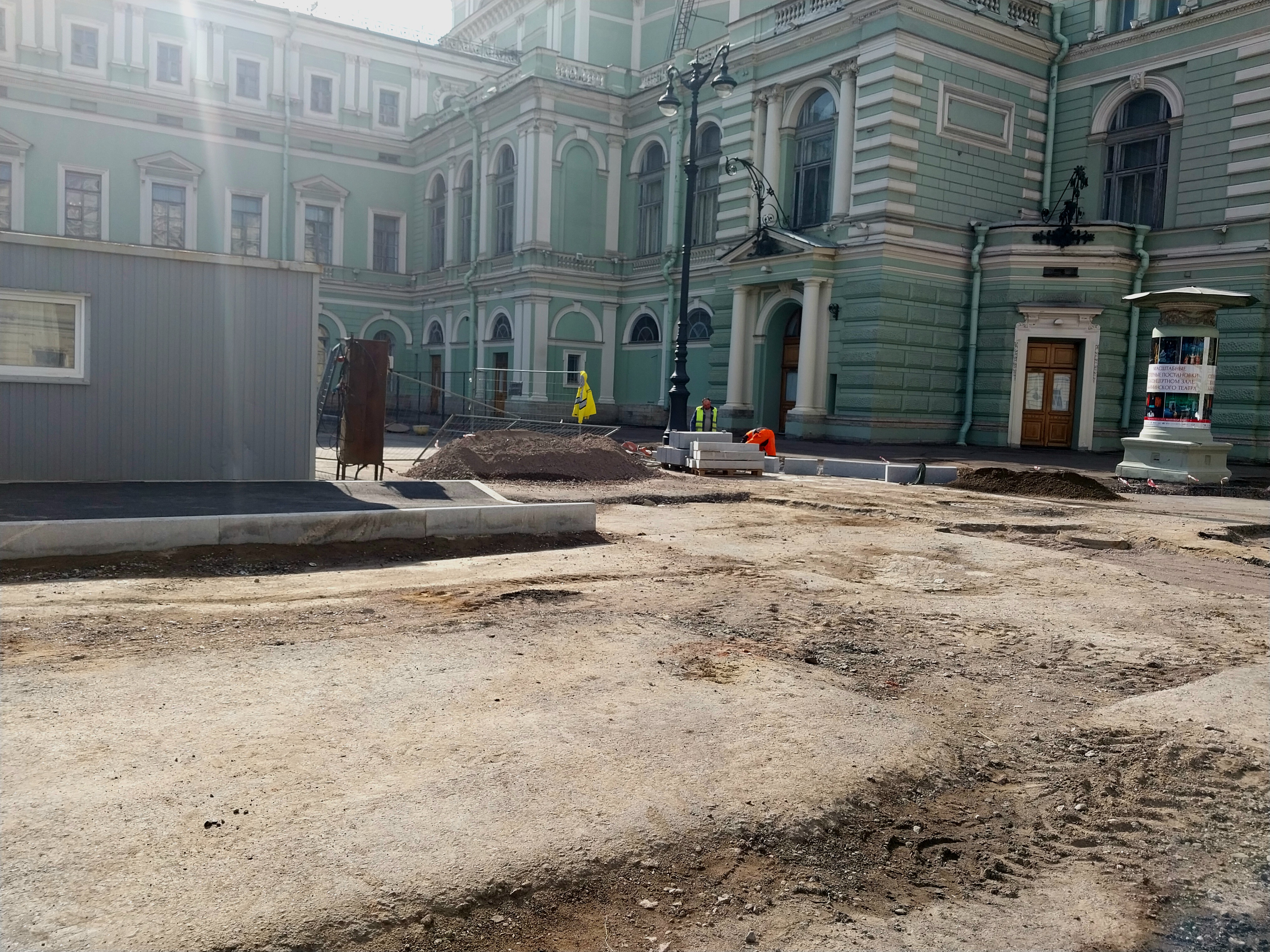 На второй стройплощадке начали укладку асфальта, у первой стройплощадки со стороны Мариинского театра идёт укладка бордюрных плит.