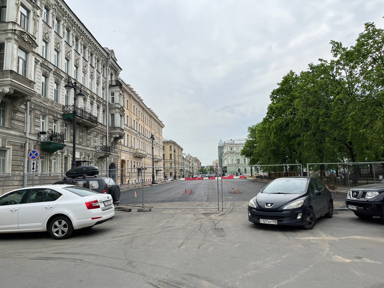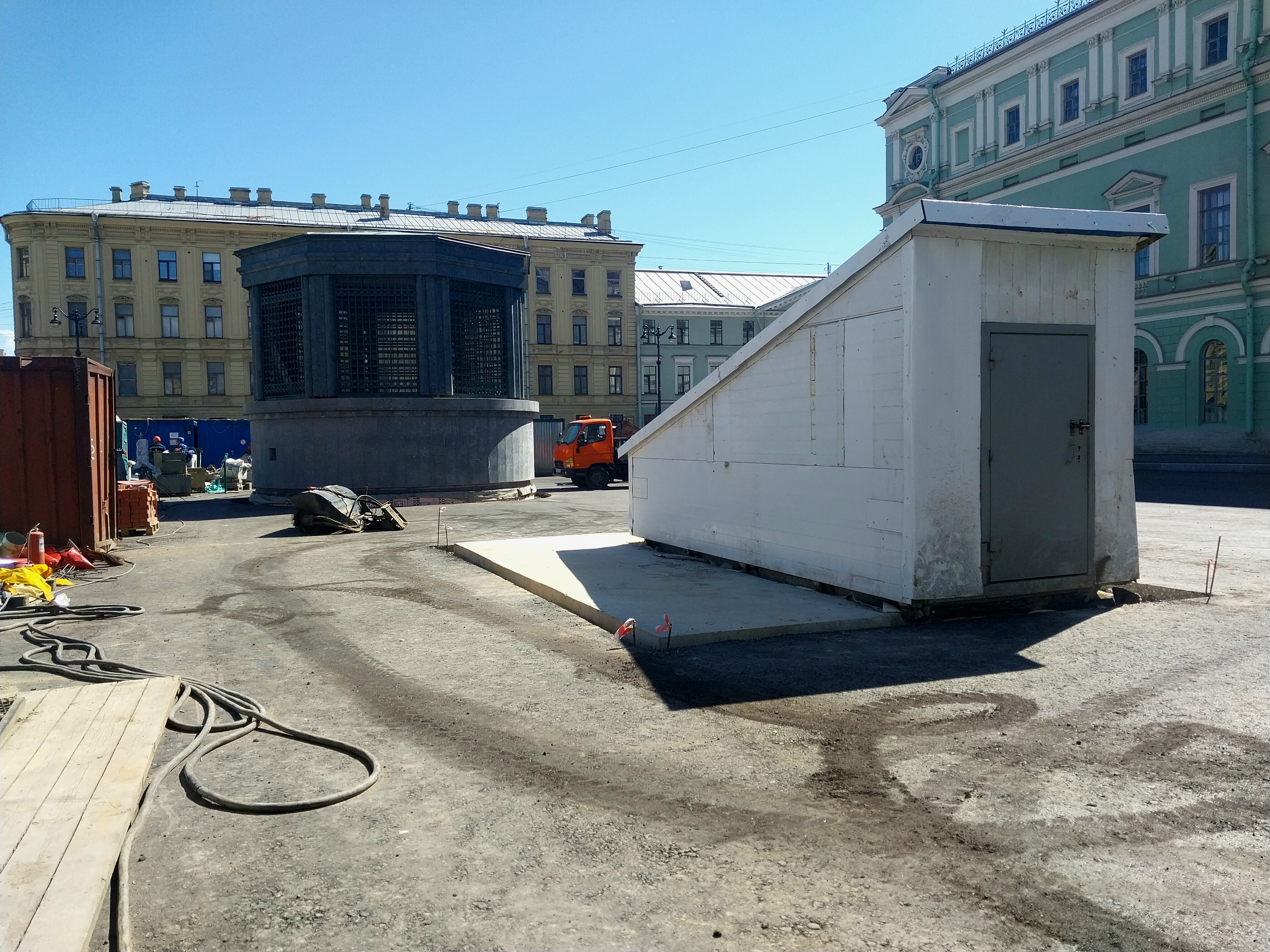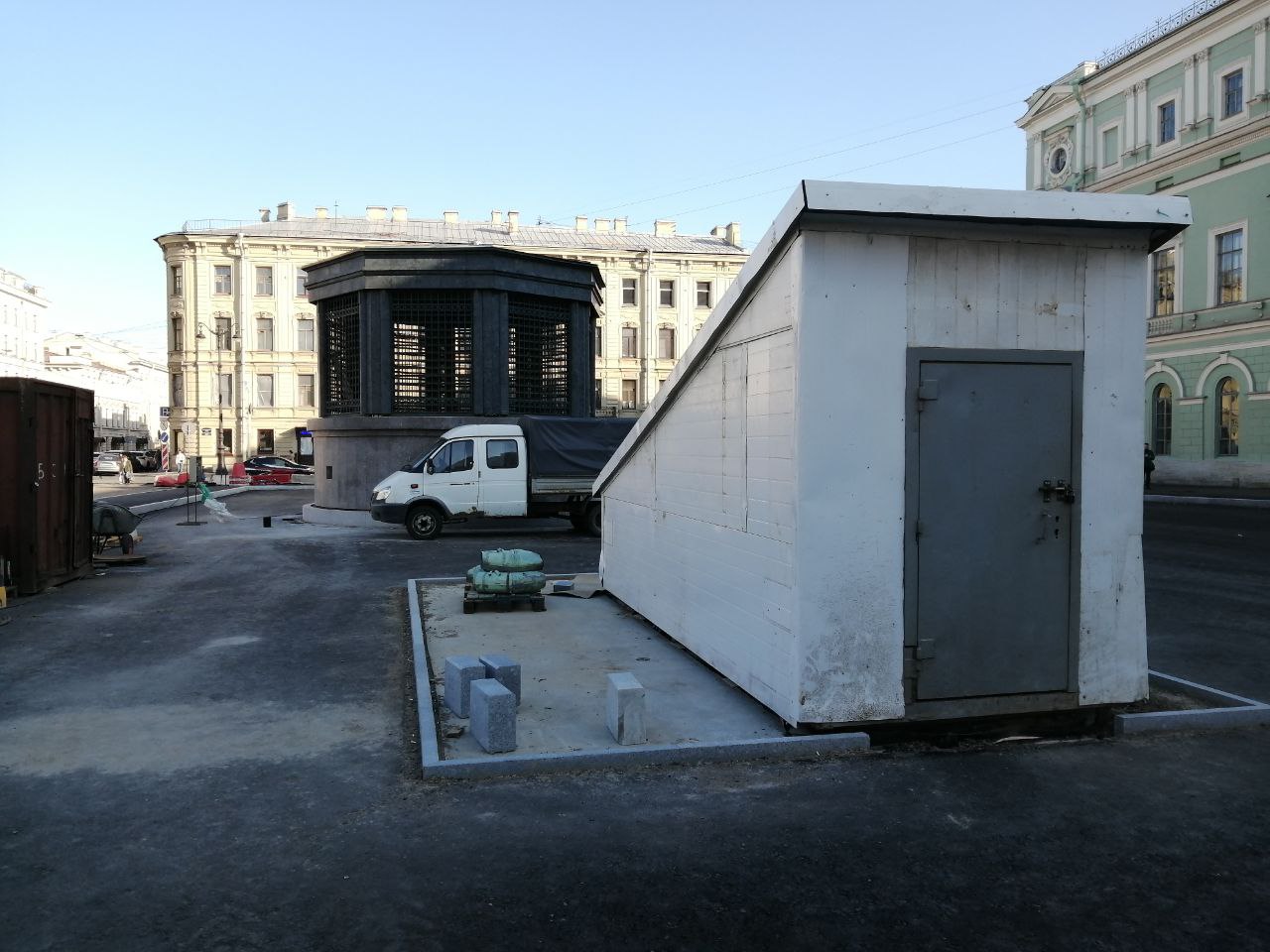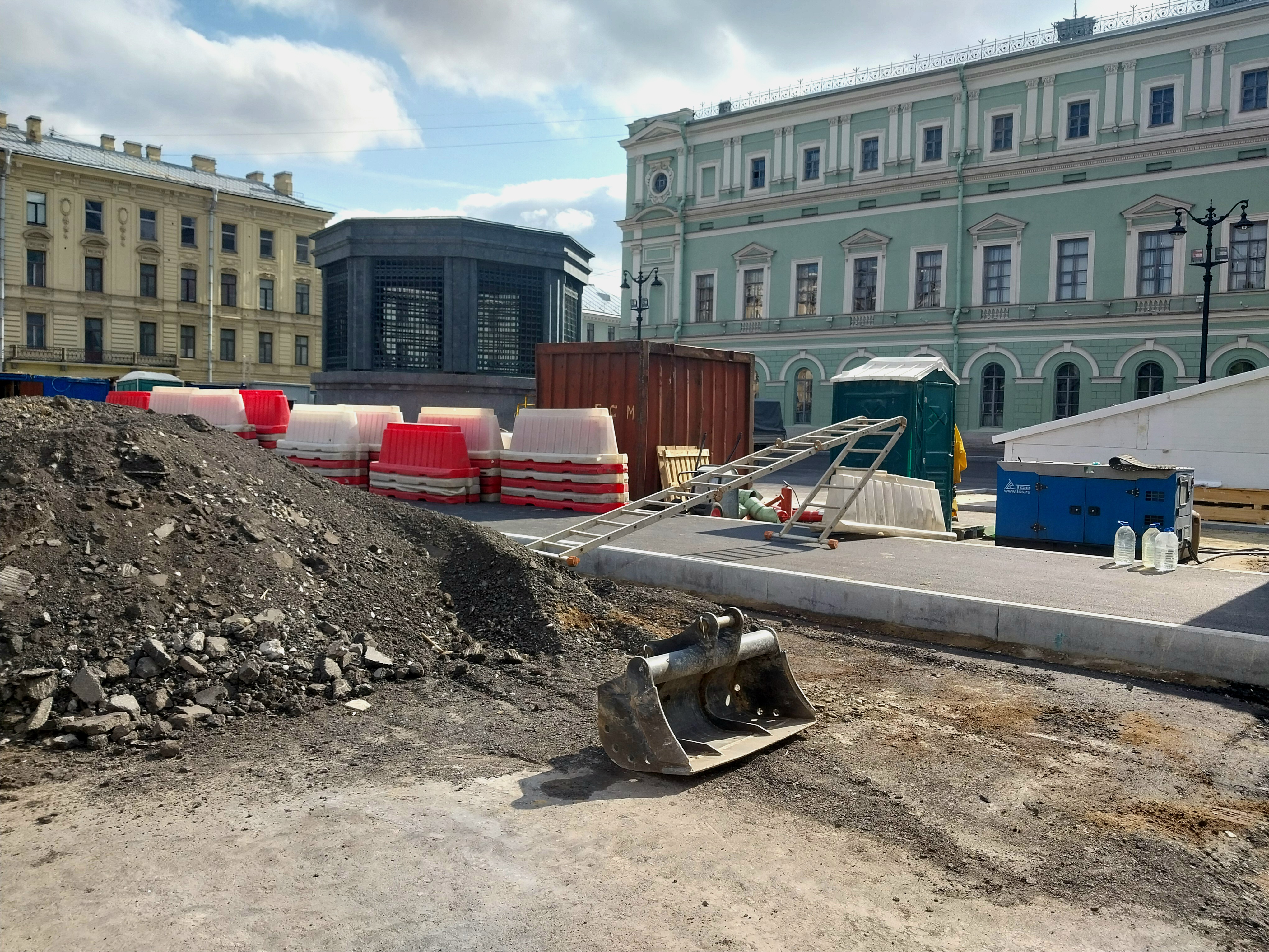 На второй стройплощадке начали укладку асфальта, у первой стройплощадки со стороны Мариинского театра идёт укладка бордюрных плит.