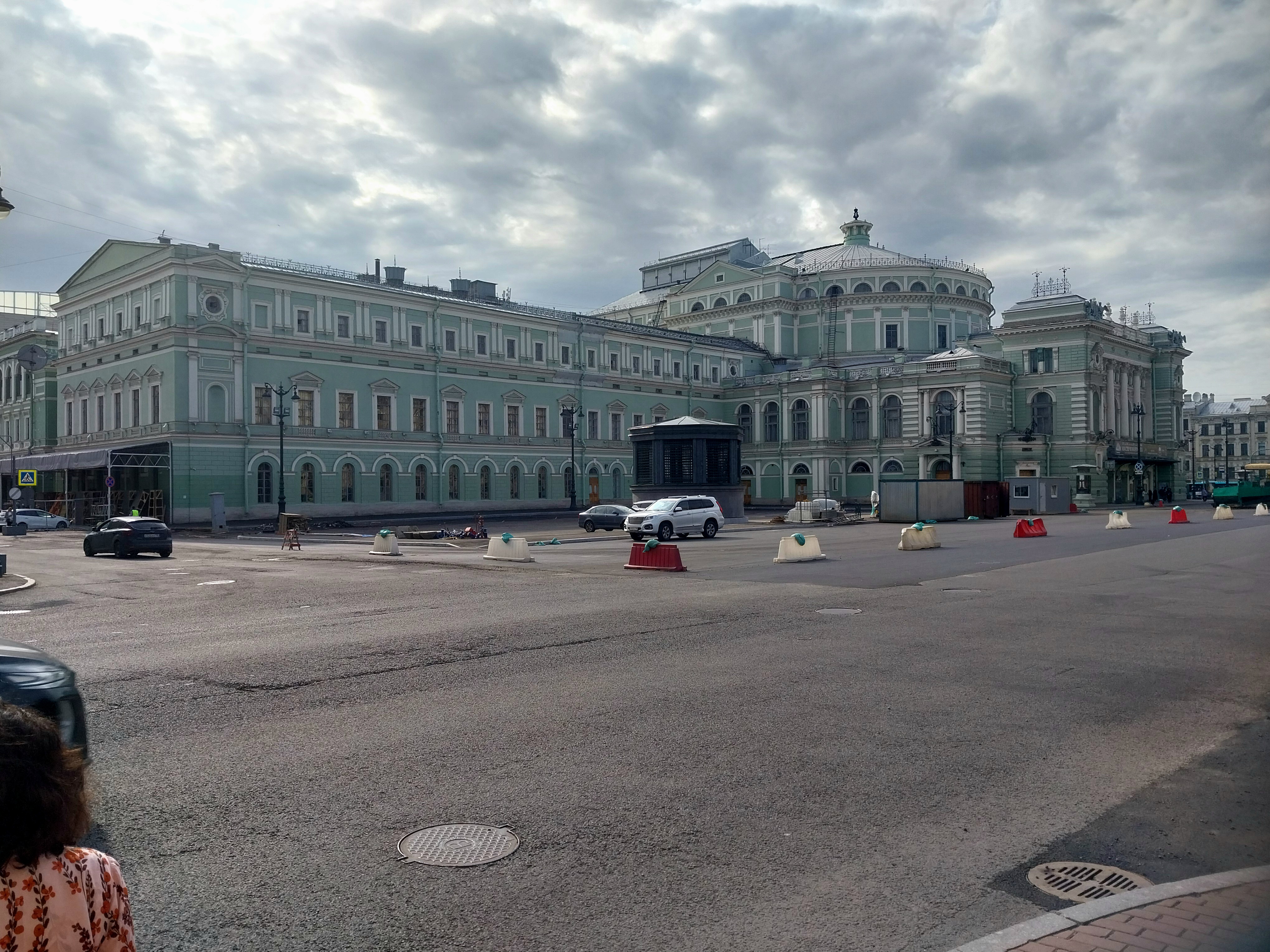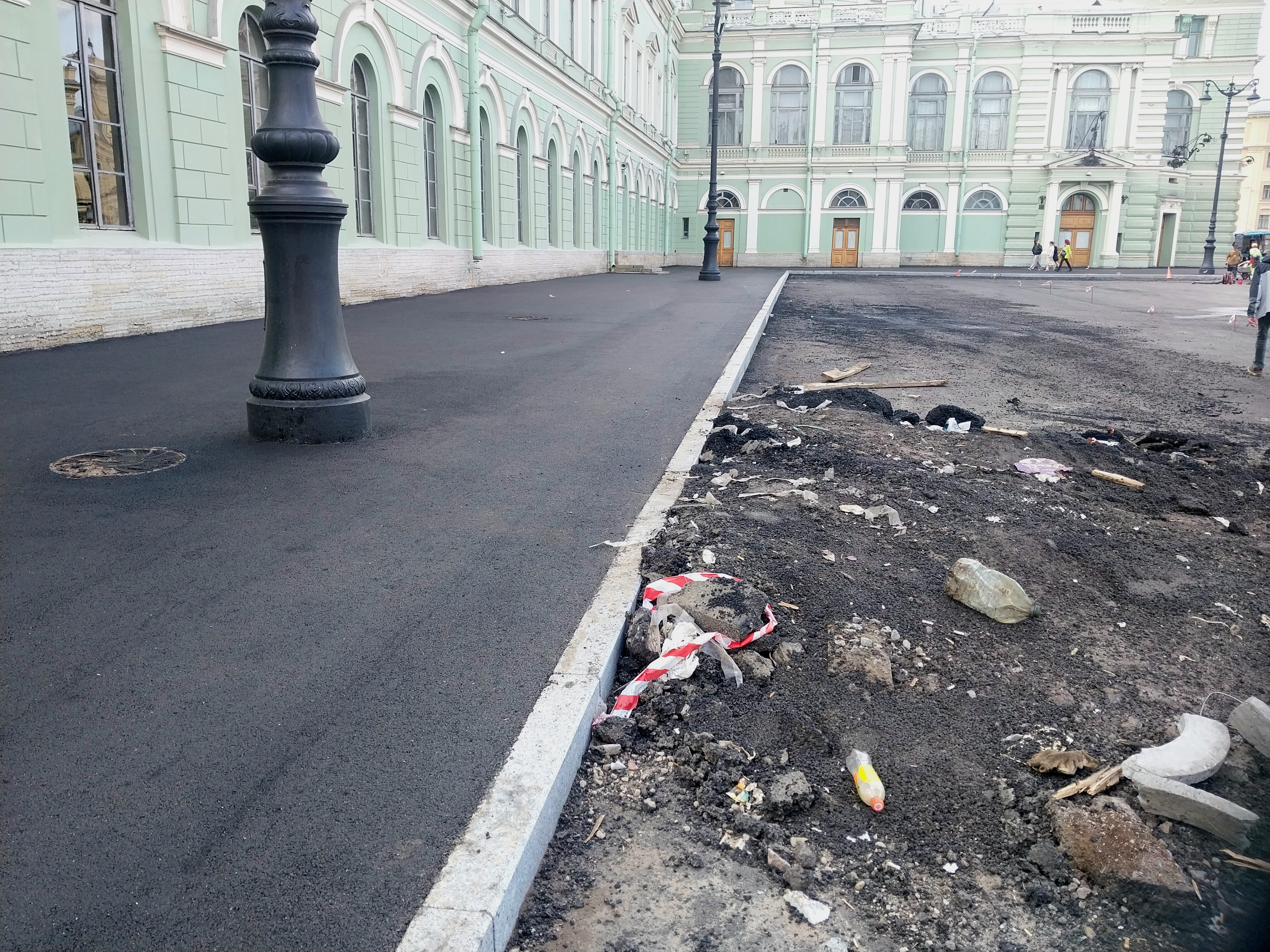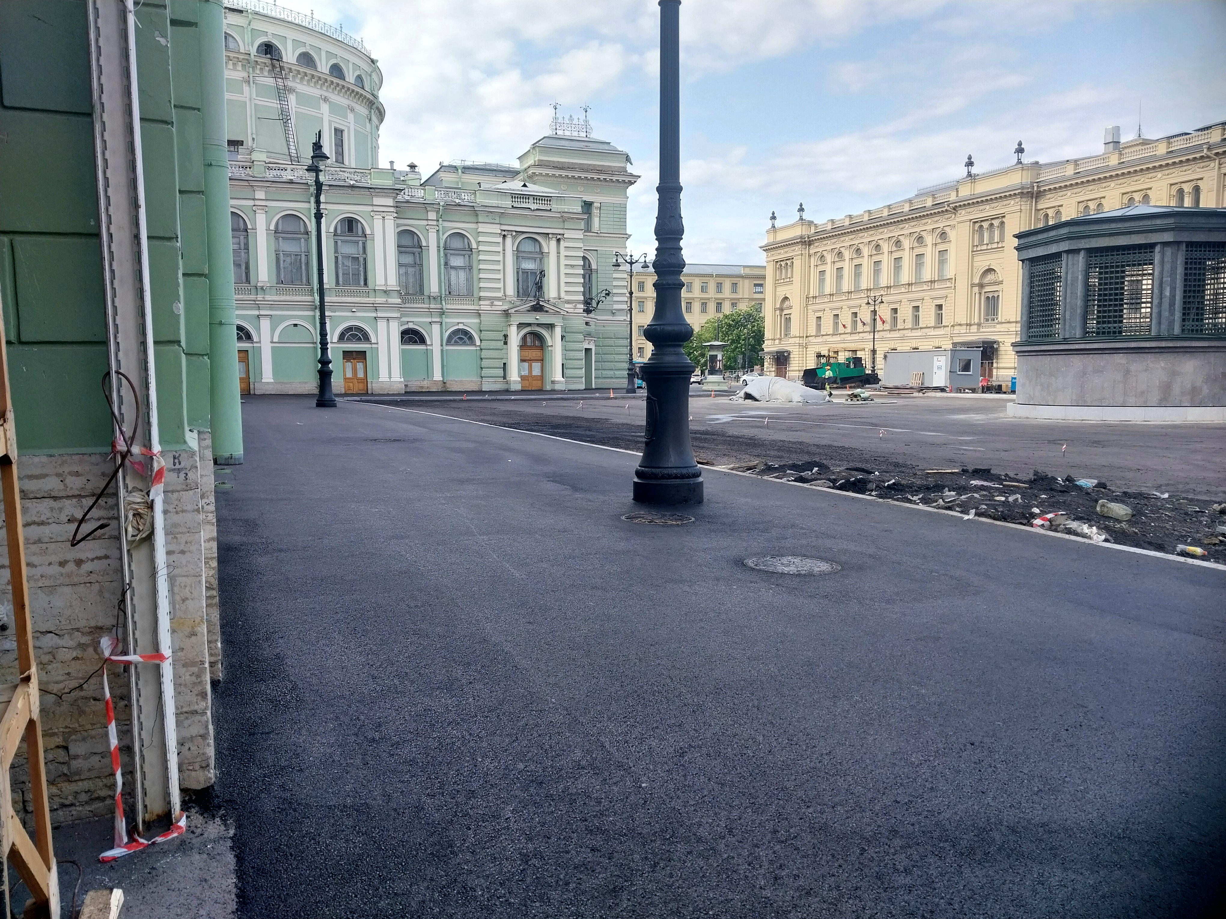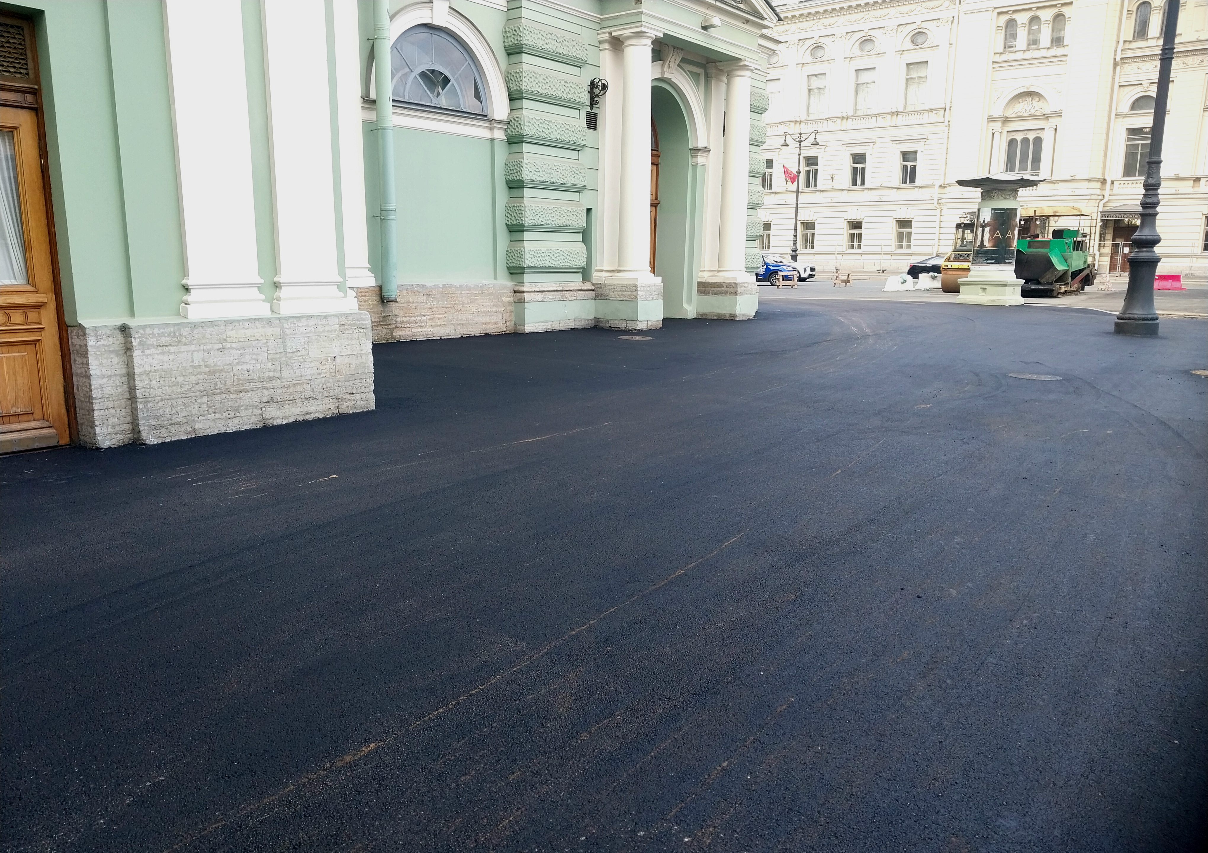 Сегодня залили асфальтовое покрытие со стороны пешеходной зоны у здания Мариинского театра. Асфальт на данную минуту ещё свежий, от него отдаёт характерным теплом и ваша обувь будет к нему немного прилипать.