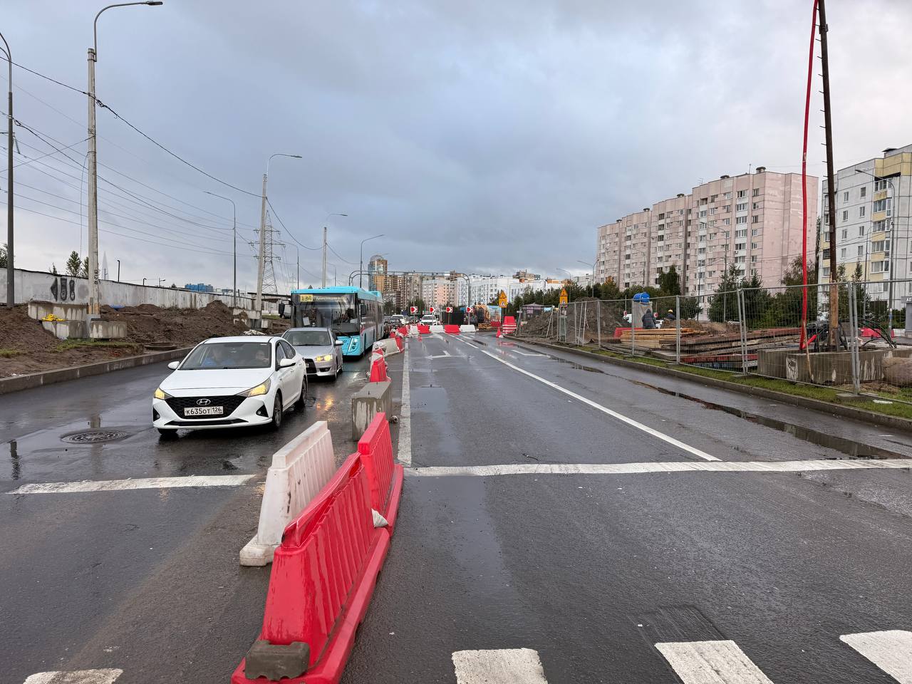 Перекрыли часть перекрёстка Шуваловский-Комендантский. Движение по временной схеме по два ряда в каждую сторону.