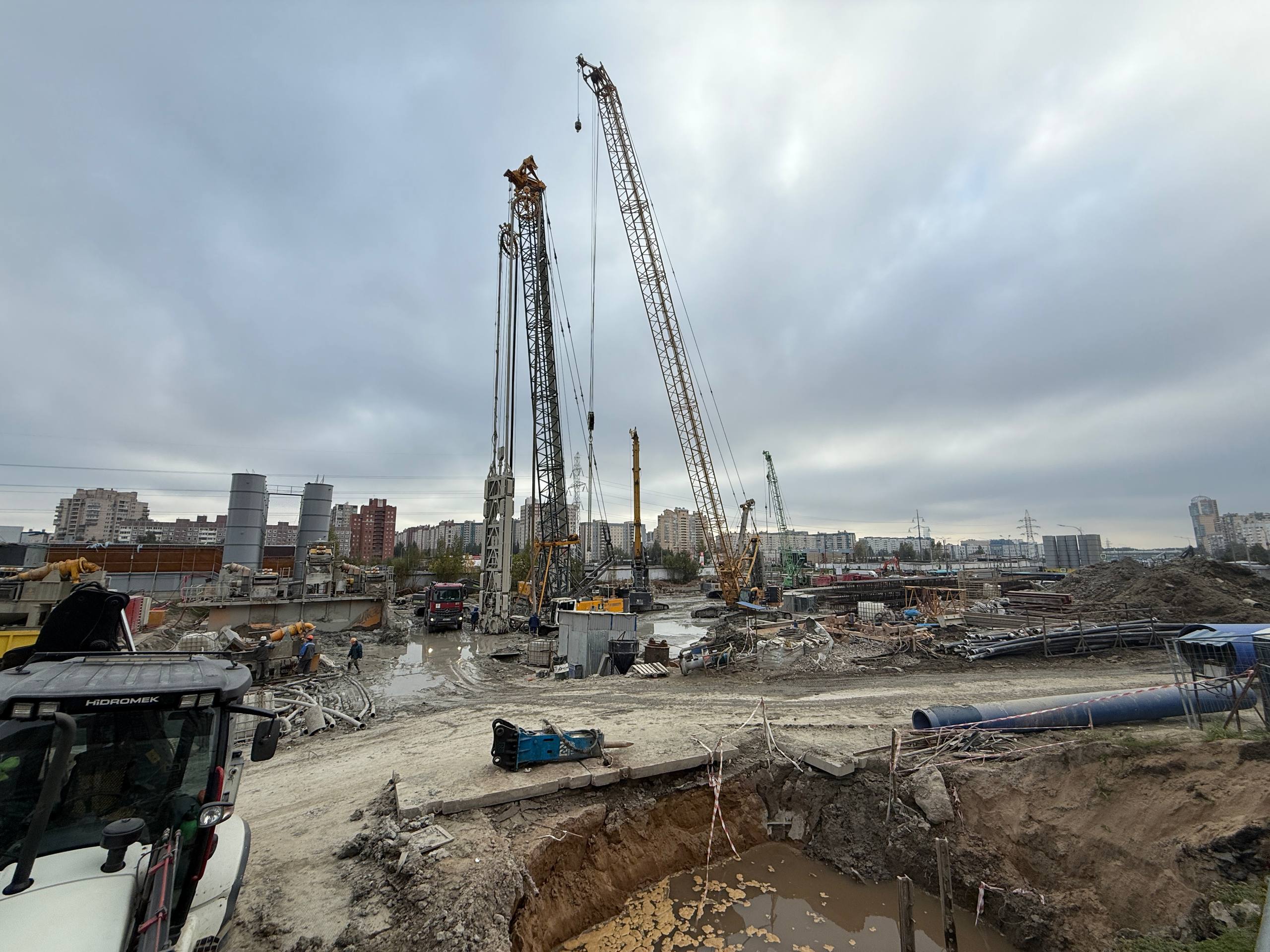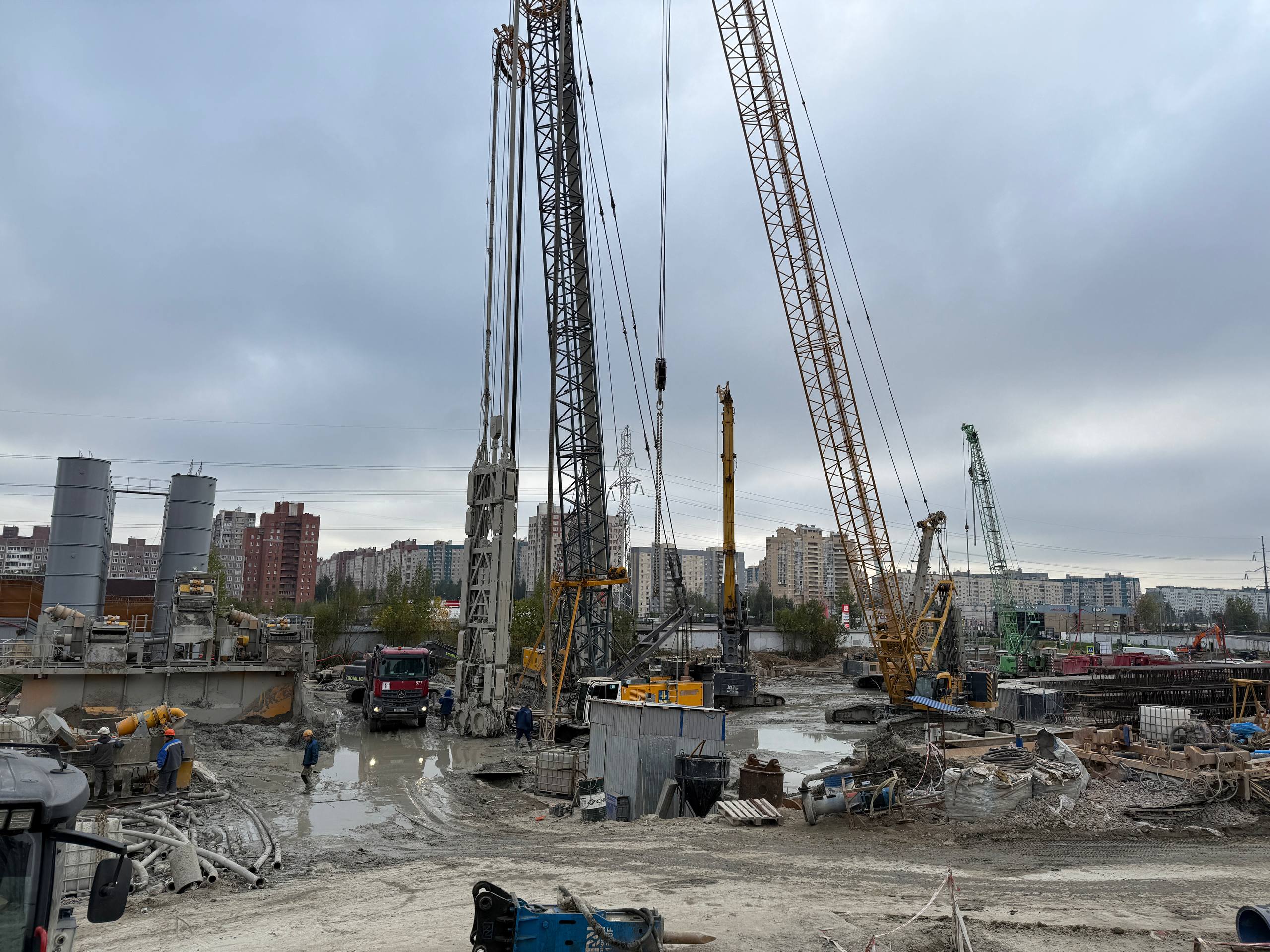 На разделительной полосе Шуваловского проспекта также ведётся сооружение форшахты входной торцевой стены станции.