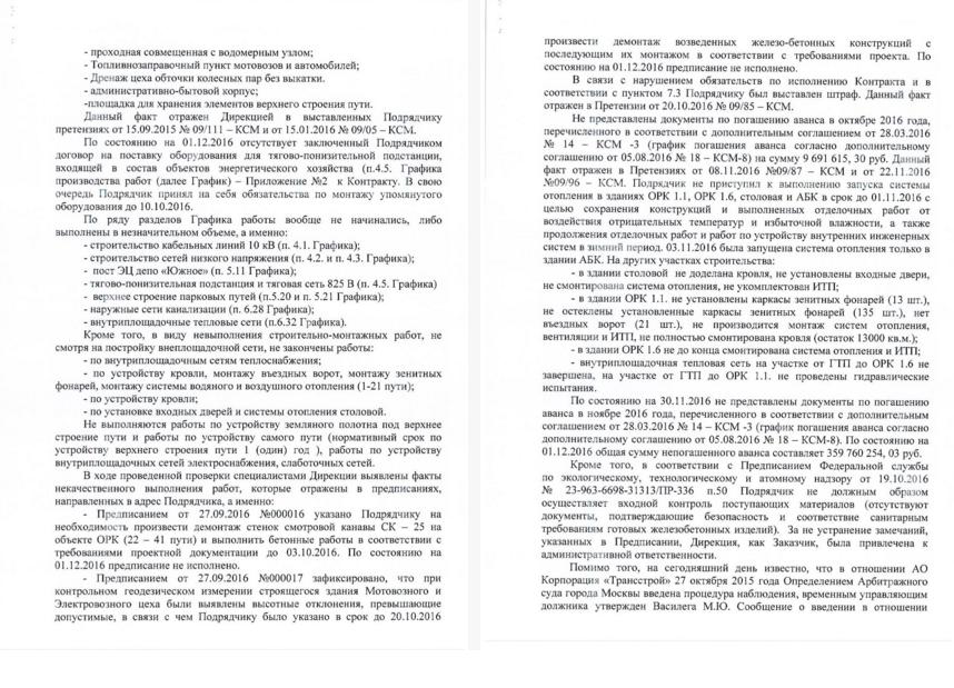 Среди причин расторжения контракта от 2014 года – отставание от сроков строительства инженерных сетей, административно-бытового корпуса, топливозаправочного пункта. Компания не успела до ноября накрыть кровлей и пустить отопление в двух отстойно-ремонтных корпусах и столовой. «Трансстрою» вменяется некачественное выполнение работ и отсутствие отчета по авансу на 10 млн рублей за октябрь.