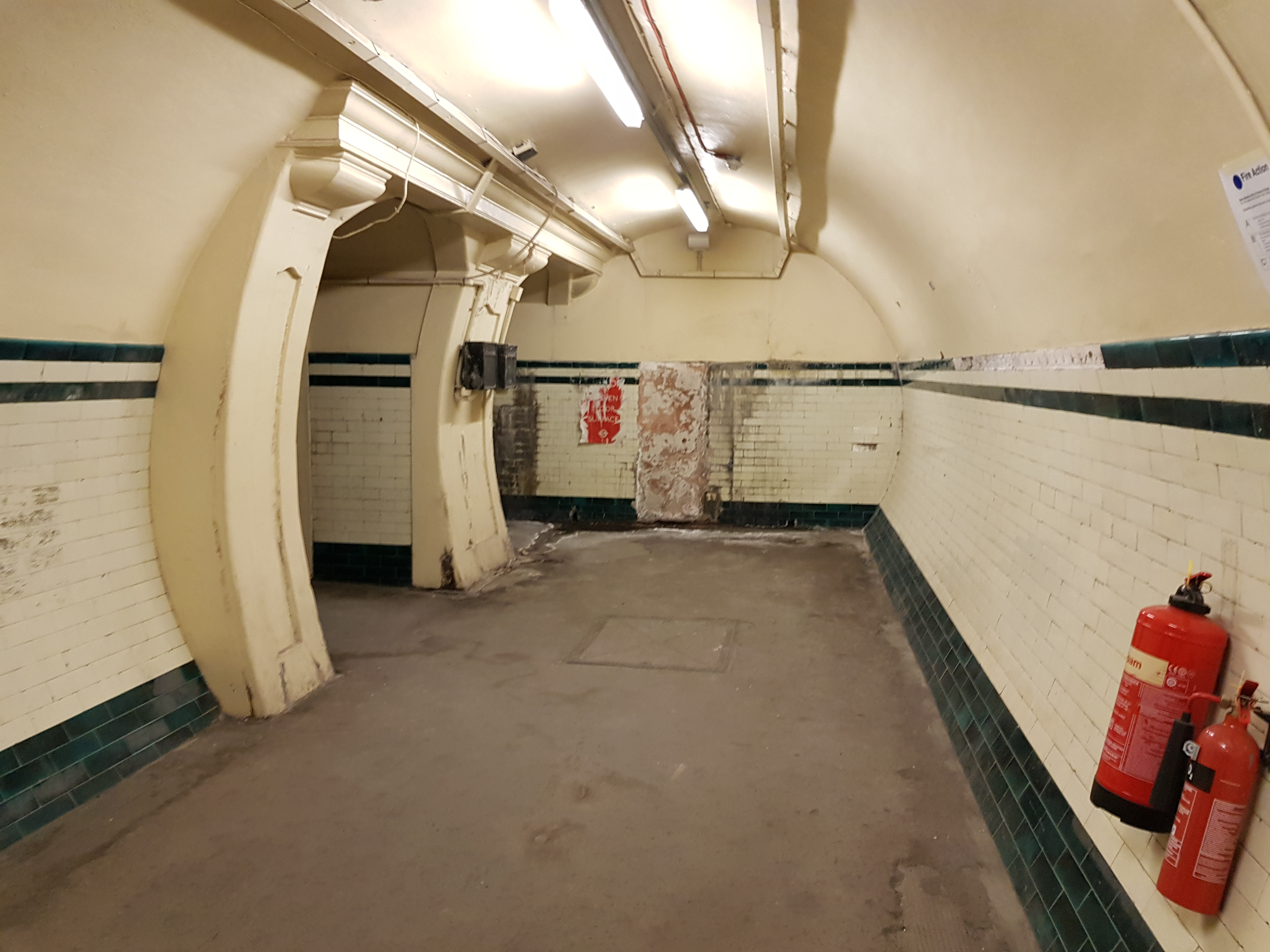 Вот вам для начала вид со стороны улицы, вид вестибюля изнутри и коридорчики. Спуск вниз осуществляется по лестнице (простите, вида сверху нет), непригодной для ежедневного использования обычными пассажирами. На последних фотках можно видеть что лифтов могло бы быть больше, но уже тогда догадывались что лишние лифты не понадобятся.