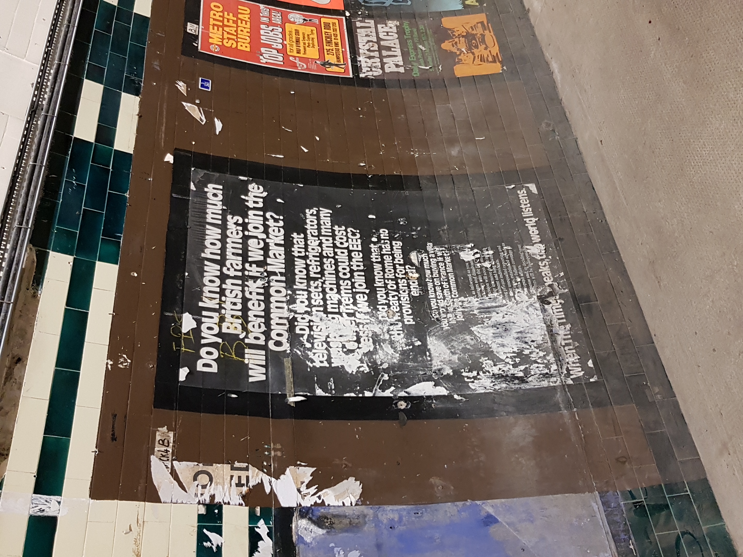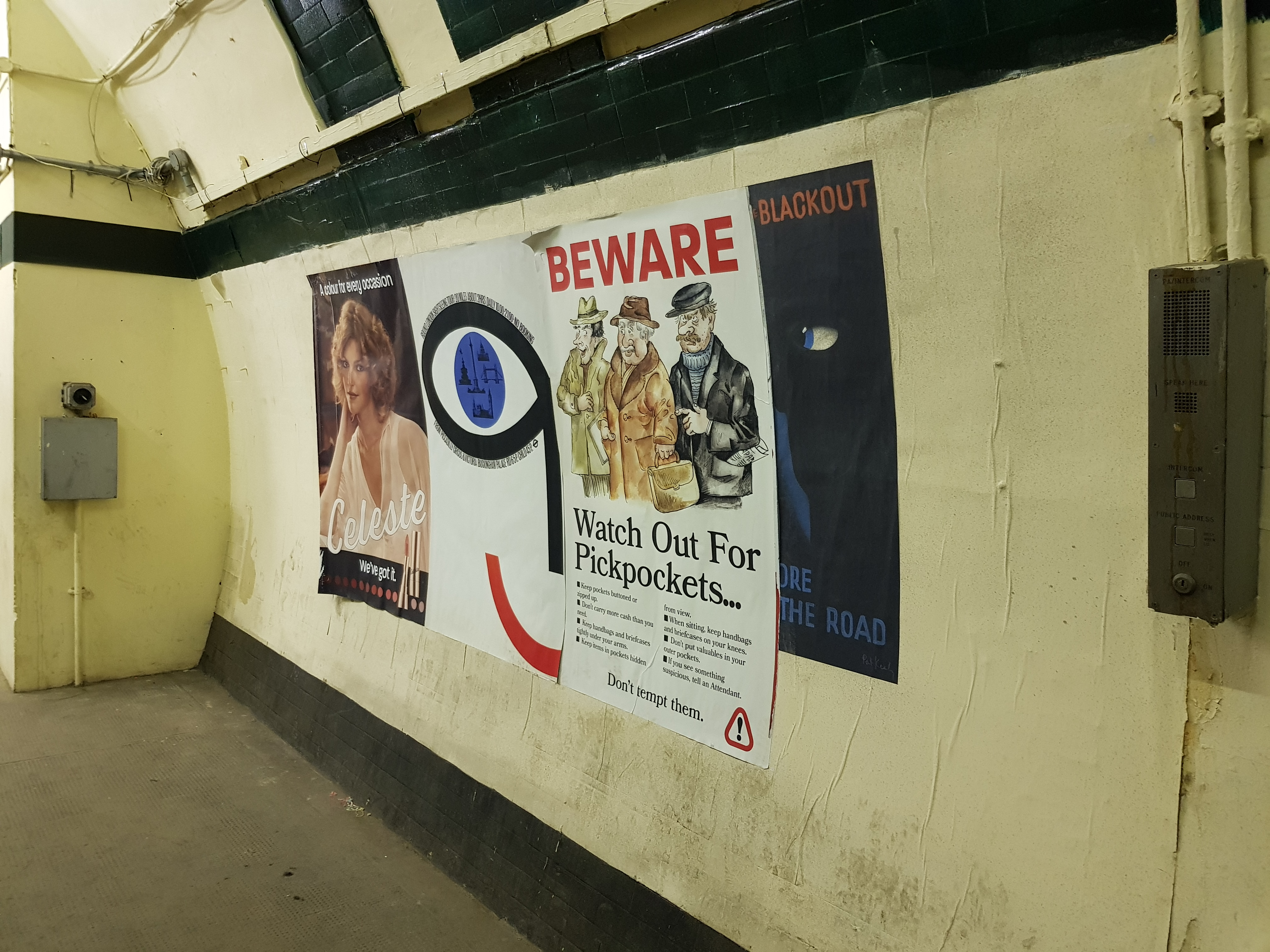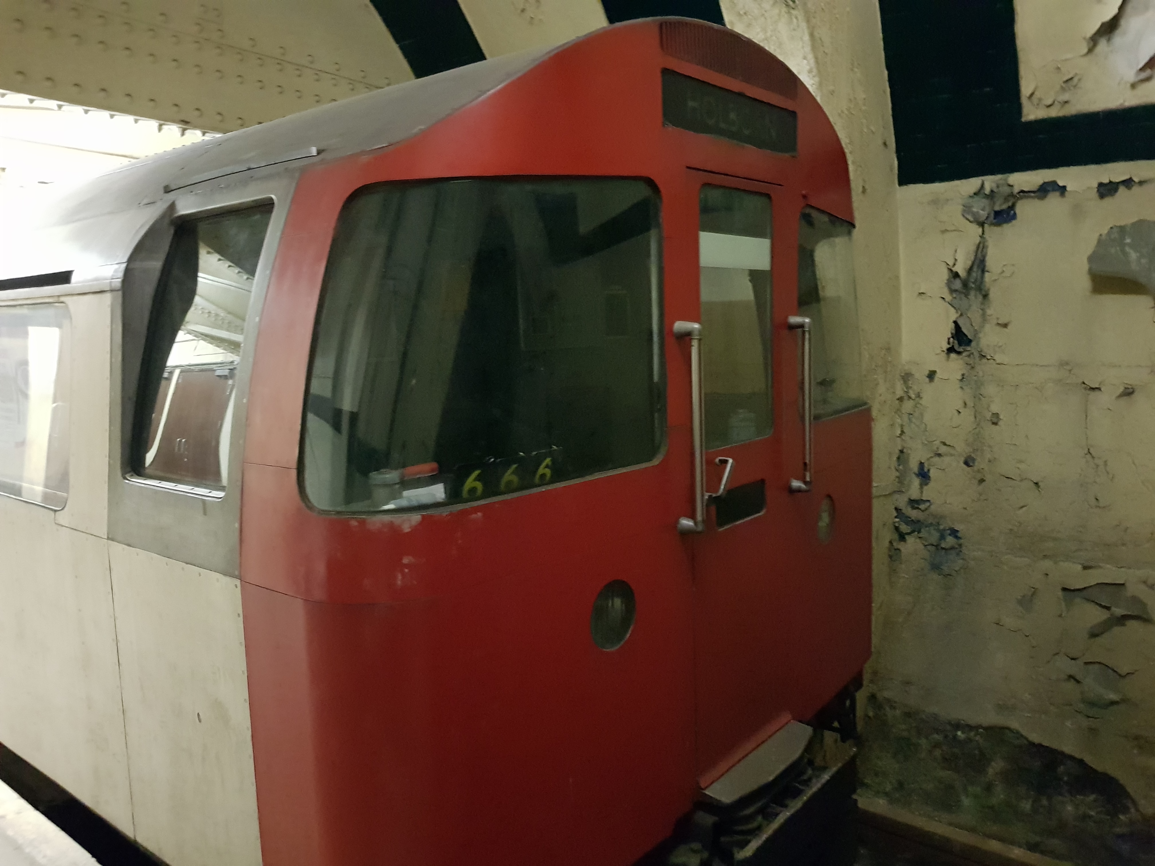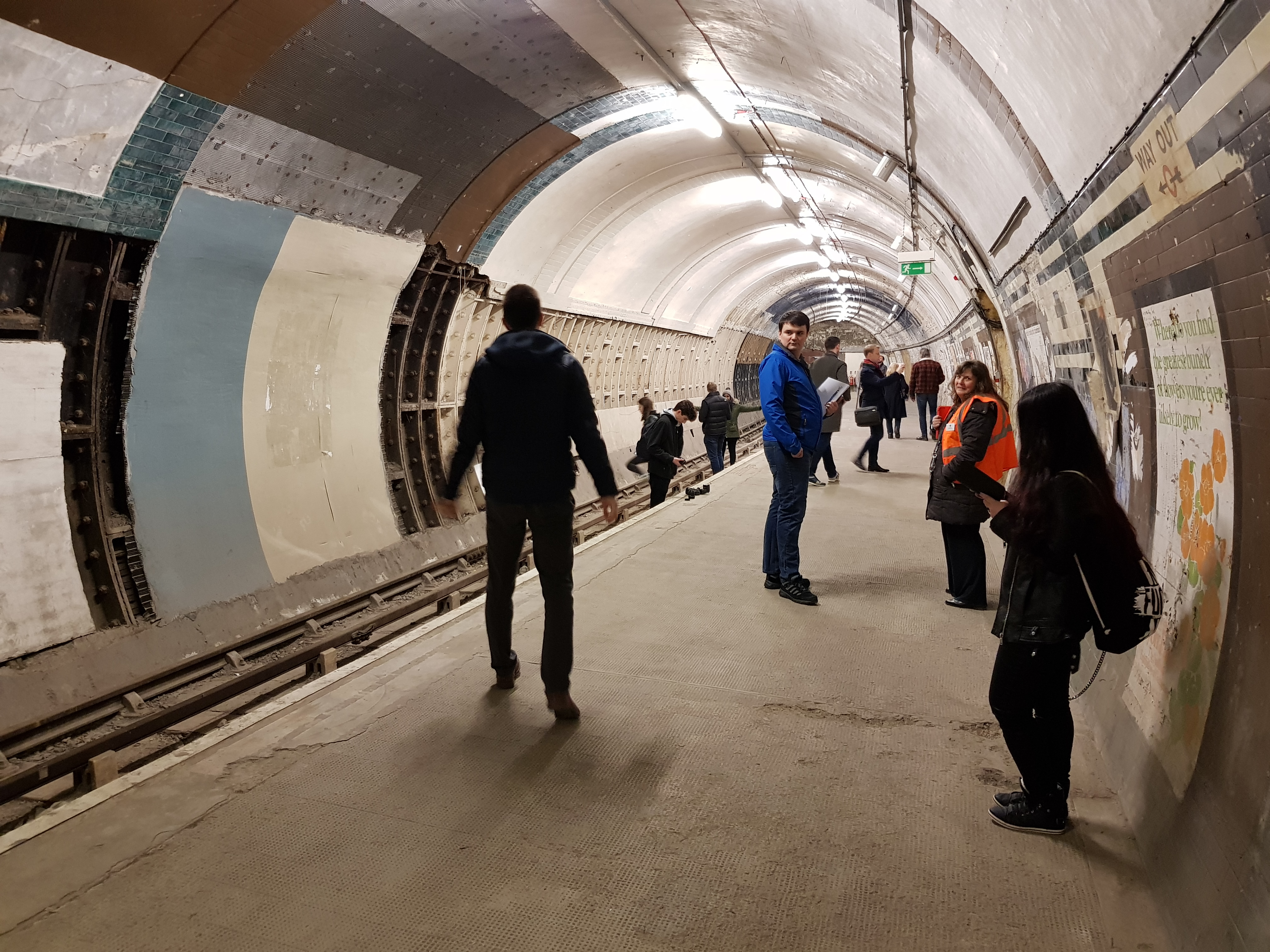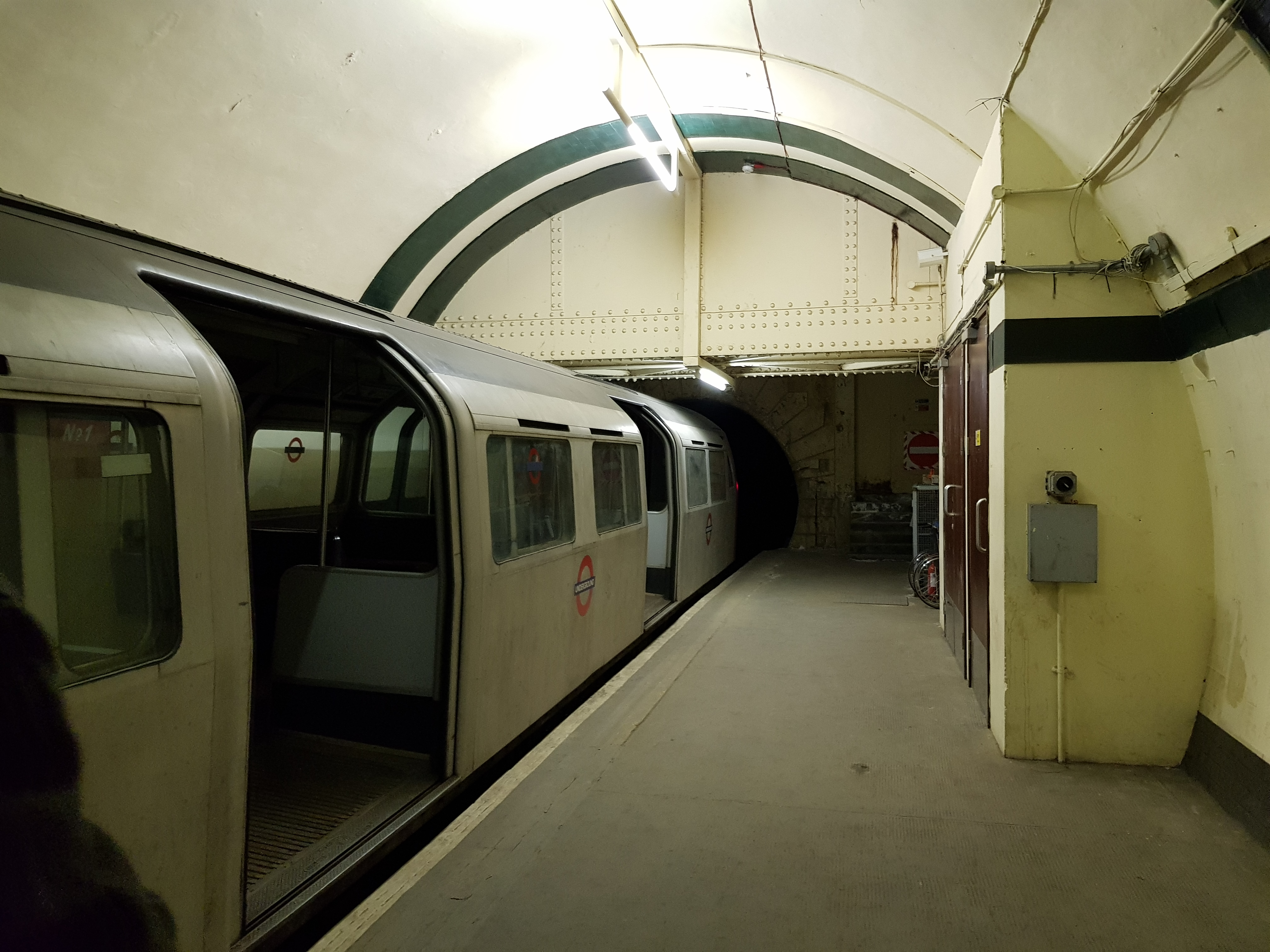 На этих фото - та платформа, что пережила 1917 год. Поезд настоящий (но старый), тоннель в действующее метро - настоящий, плакаты - нет, это киношники повесили. Видно что на части станции потолок не отделан, а просто тюбинги покрашены - это они киношниками покрашены, изначально там отделки вообще не было (не помню стояла ли стена, как на Василеостровской, надо бы проверить).