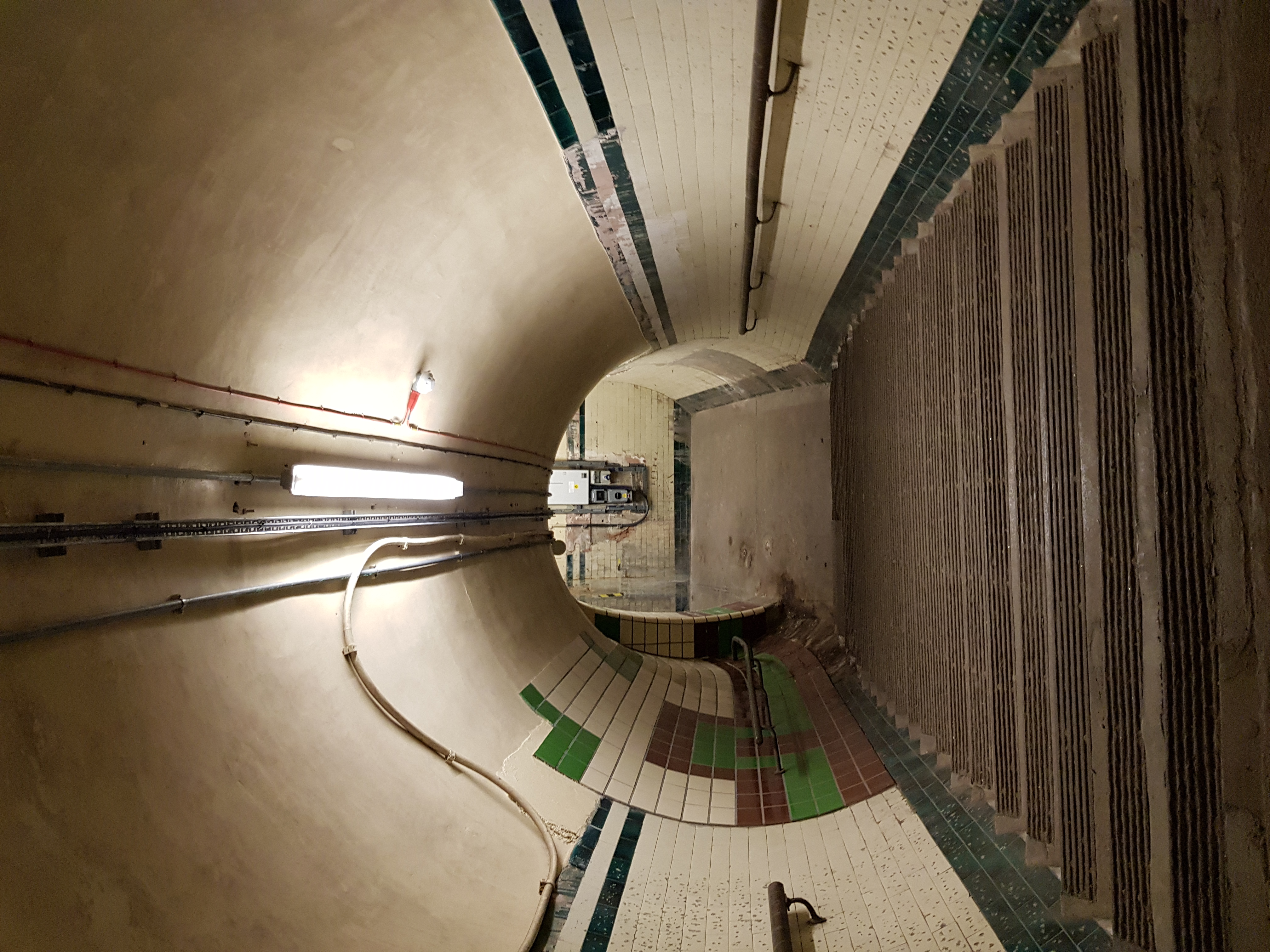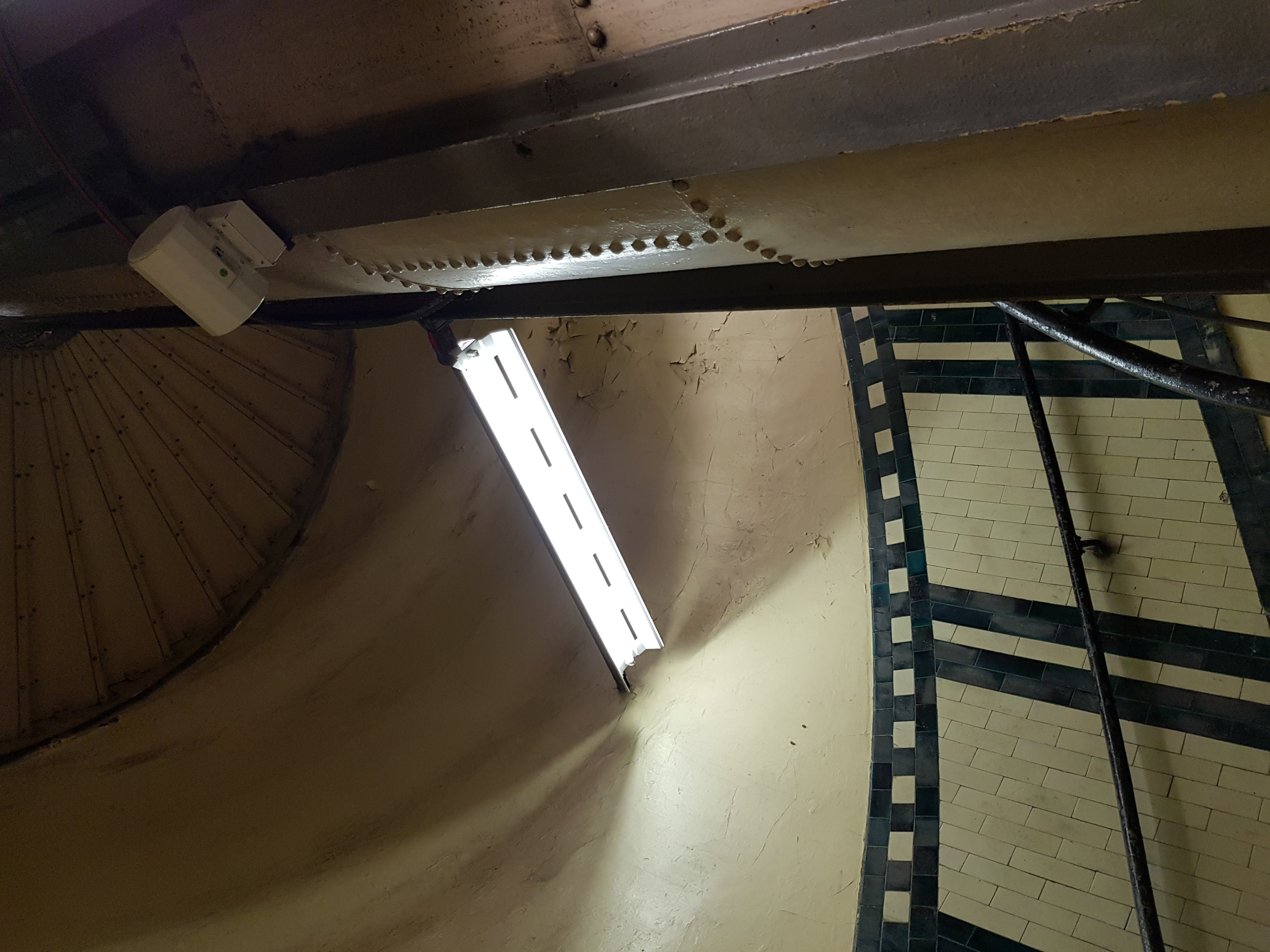 Фотанек лесенки сверху нет, зато есть фотанька лесенки снизу. И даже есть фото лесенки снизу при выключенном свете - во времена работы станции такого не было, это в недавнее время ради проверки так сделать решили.