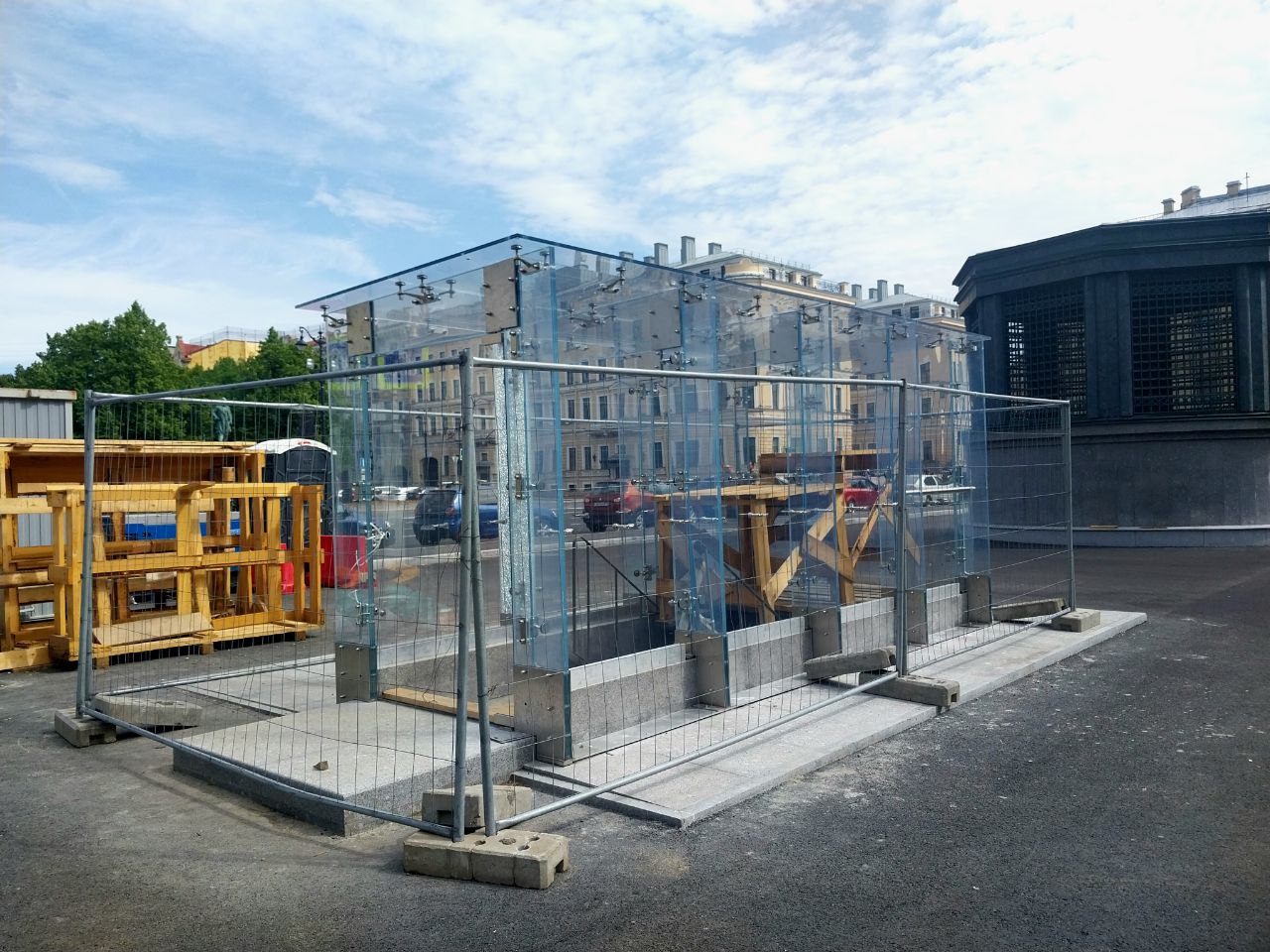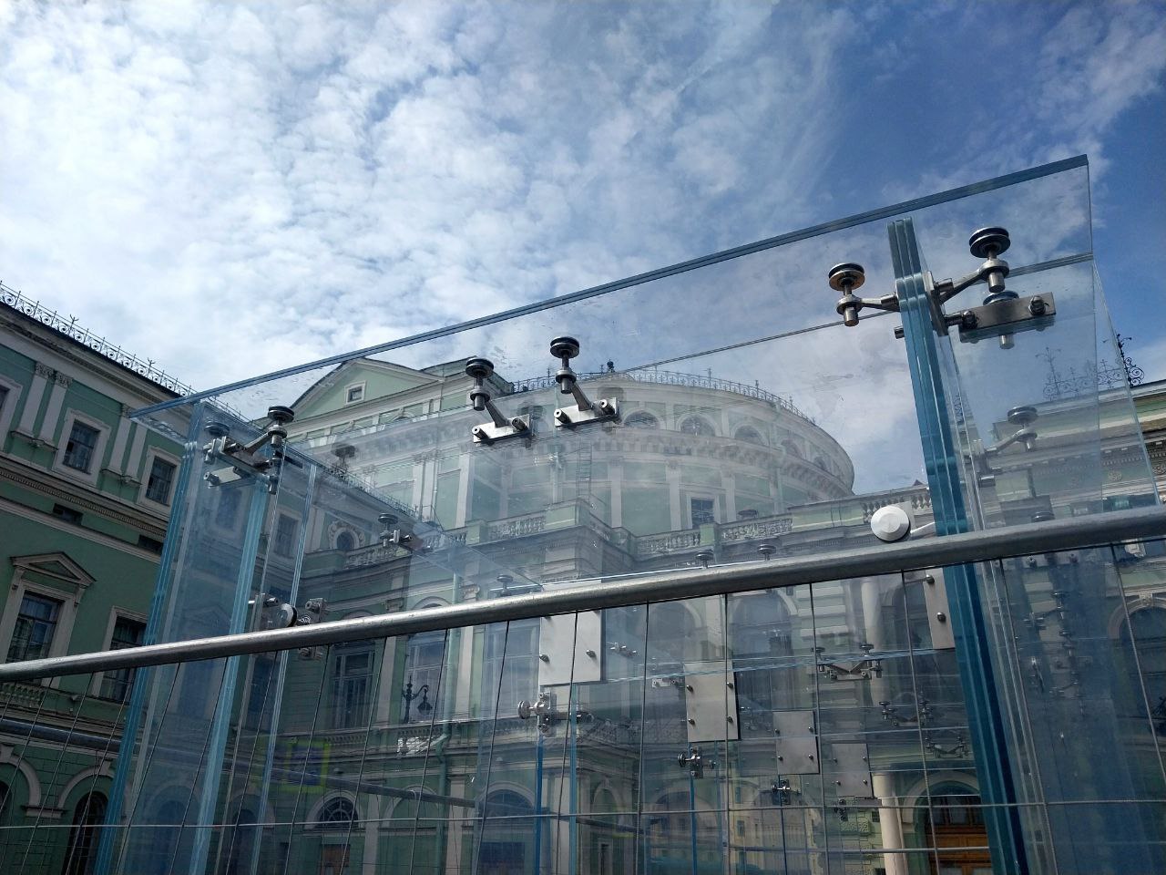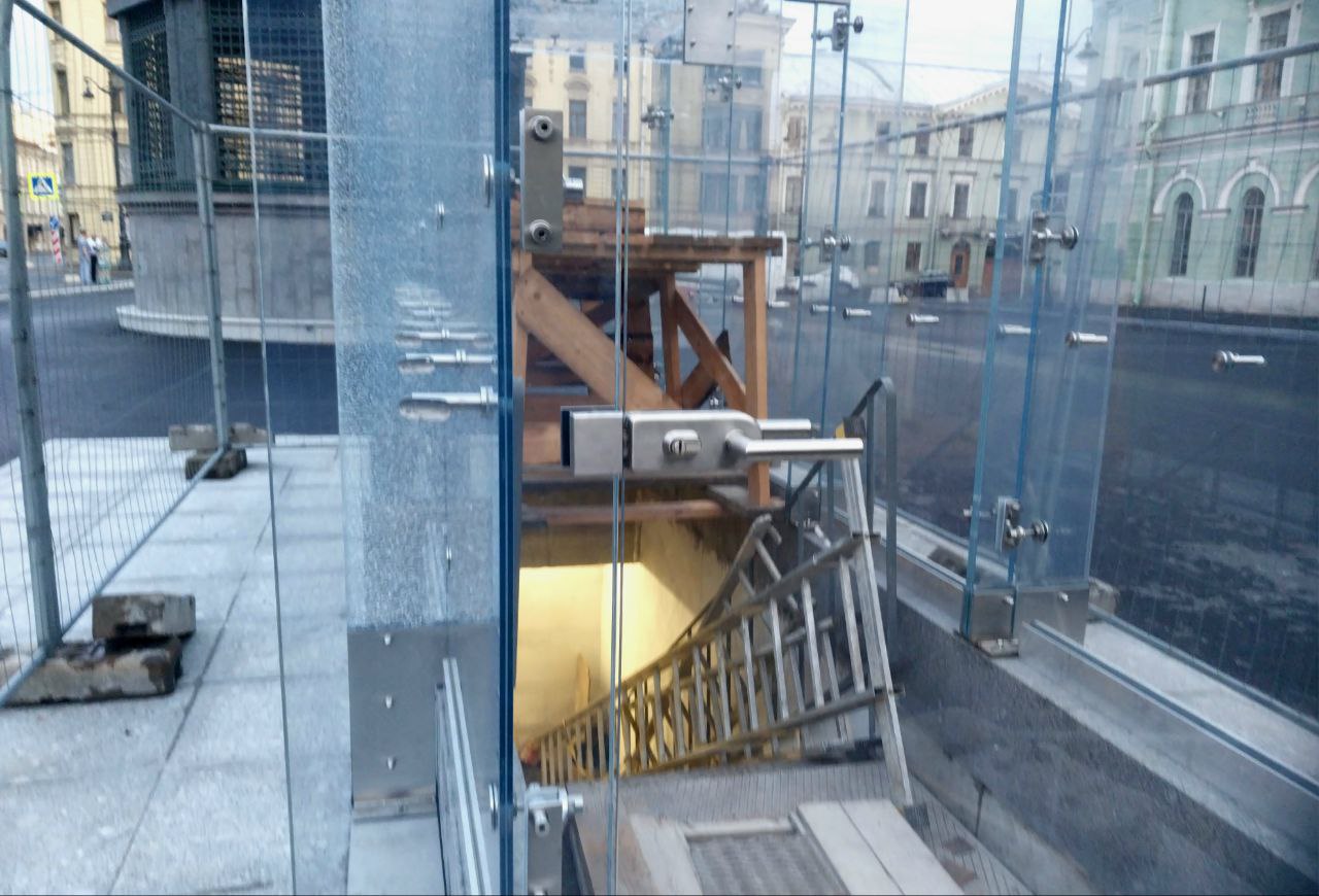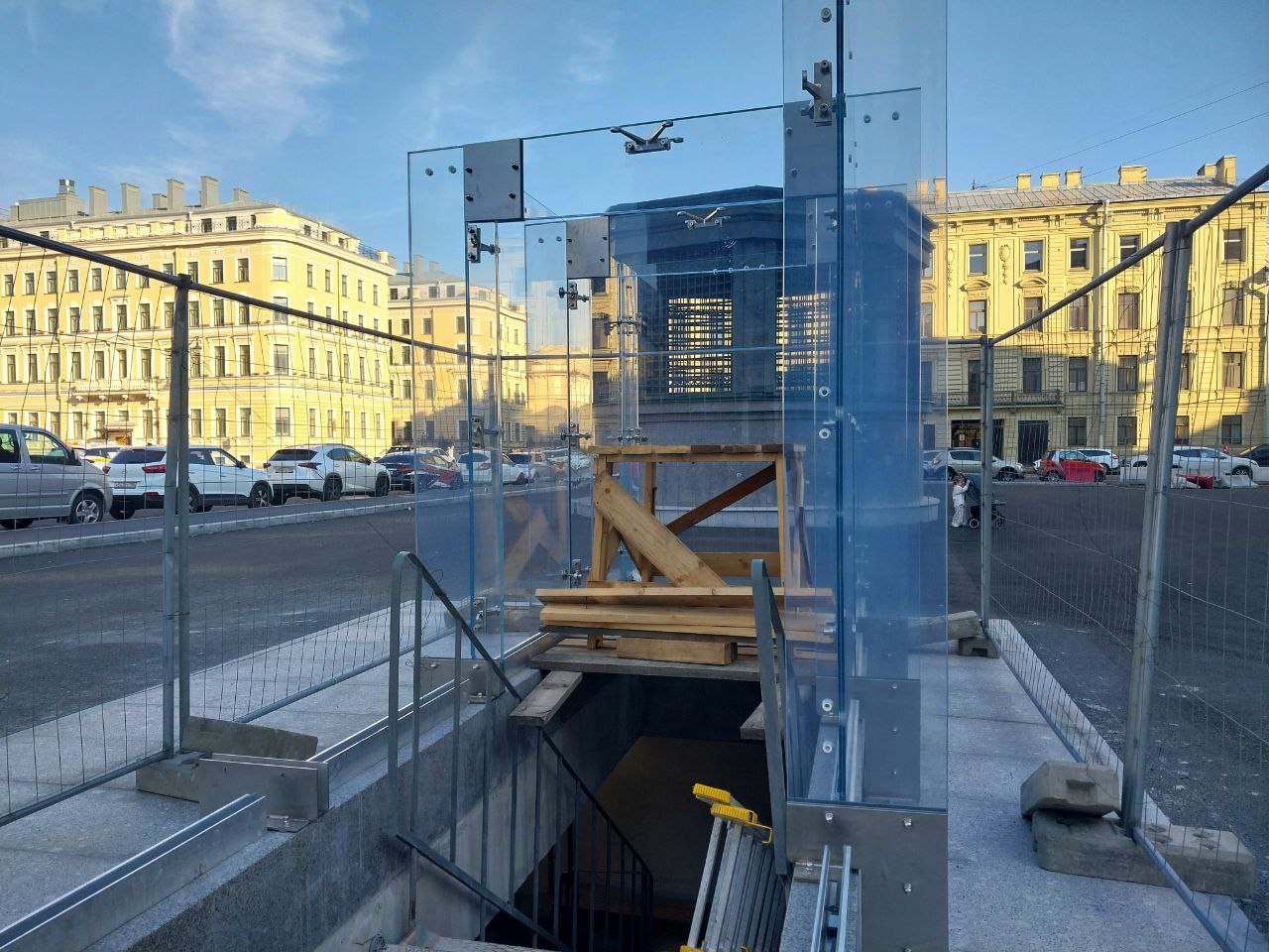 В стеклянном павильоне эвакуационного выхода установили стеклянную крышу.