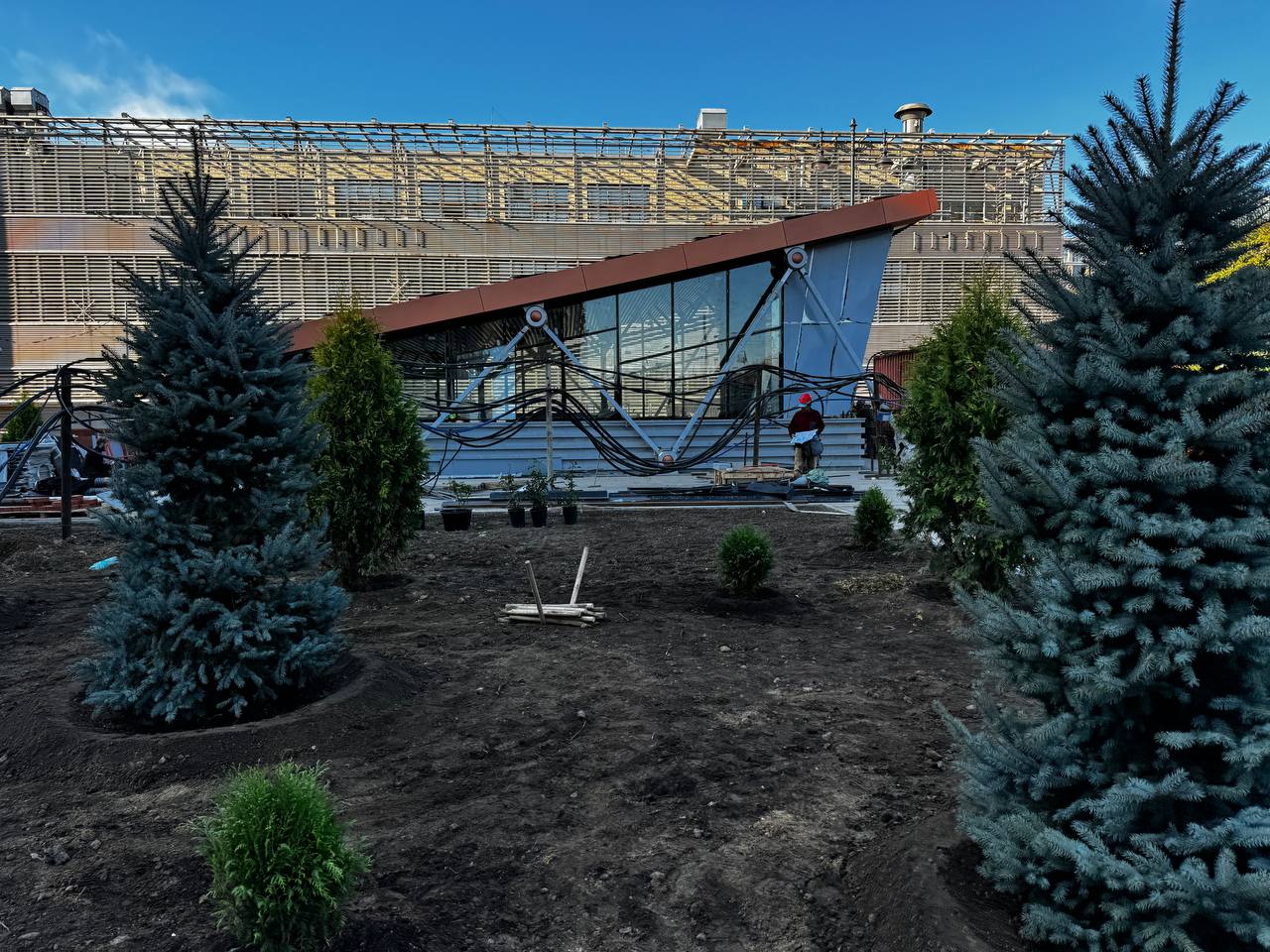 На площади перед наземными павильонами станции «Горный институт» Лахтинско-Правобережной (четвертой) линии Петербургского метрополитен продолжается благоустройство, в оформившиеся газоны и клумбы высаживают декоративные растения, если учесть, что эта площадь находится на плите покрытия вестибюля - то в городе проявился один из немногочисленных представителей «зелёной кровли»!