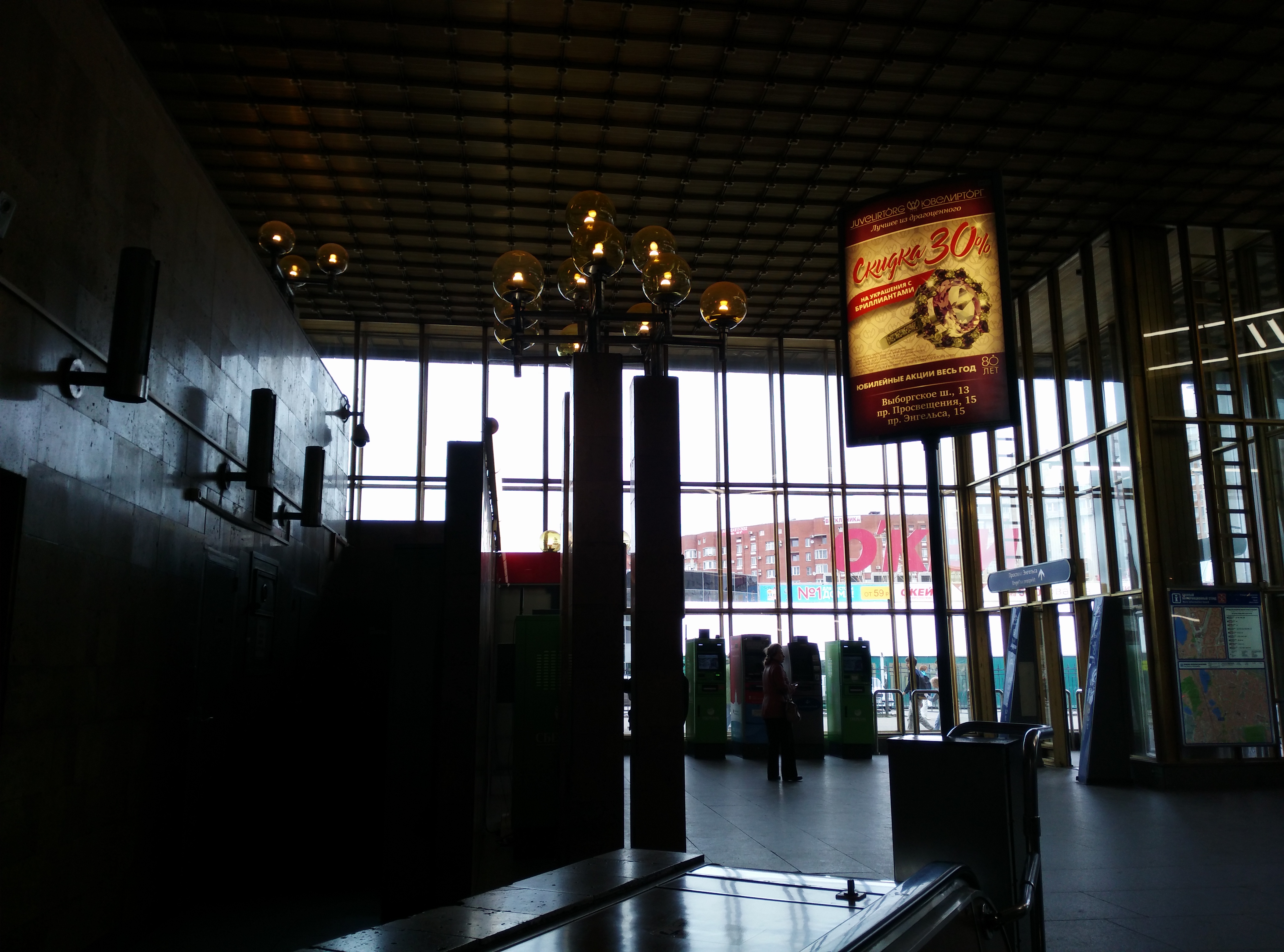 Печалит то, что новые лампы в шарообразных светильниках очень тускло светят по сравнению с потолочными и боковыми (над кассами и на стене напротив) световыми линиями.