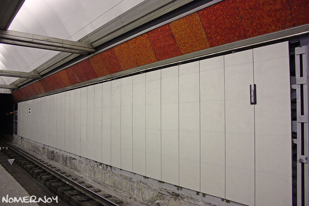 На эскизах это, наверное, смотрелось красиво. Однако, качество исполнения и сам проект подкачали. Красные мозаичные панно изначально неоднородны, а ожидать от плитки, даже при идеальной укладке и качестве, что она останется идеально белоснежной, не запылившись и не испачкавшись весьма опрометчиво. Так, что вскоре Пионерская стала ассоциироваться с пионерами, которые целую неделю занимались сбором металлолома. :twisted: