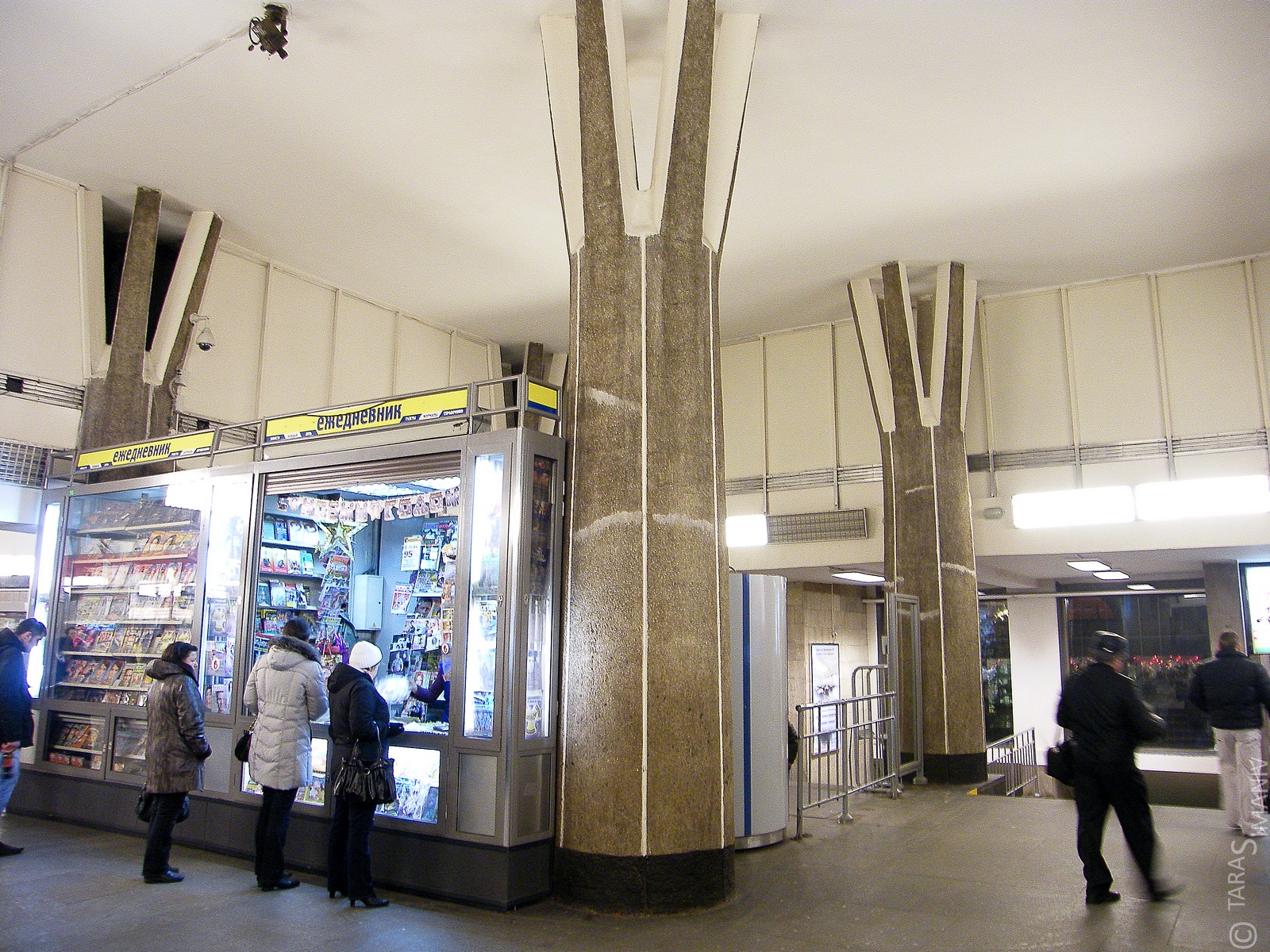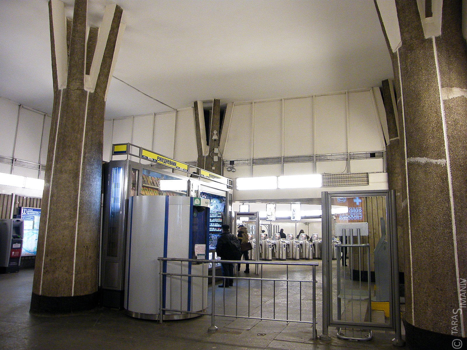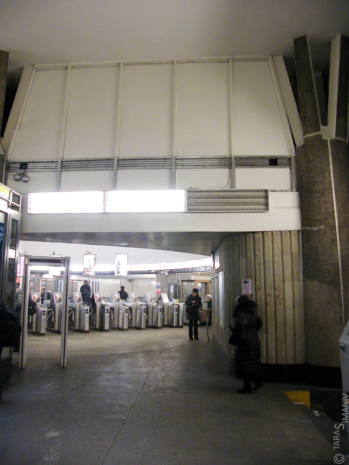 Тут во время просмотра фото пришла в голову мысль, как можно было бы увеличить вестибюльное пространство на входе. Просто поменять его местами с выходом. А кассы поставить вместо киоска. Пассажиропотоки-то с обоих сторон одинаковы, так что внизу перекрещивание осталось бы на прежнем уровне.