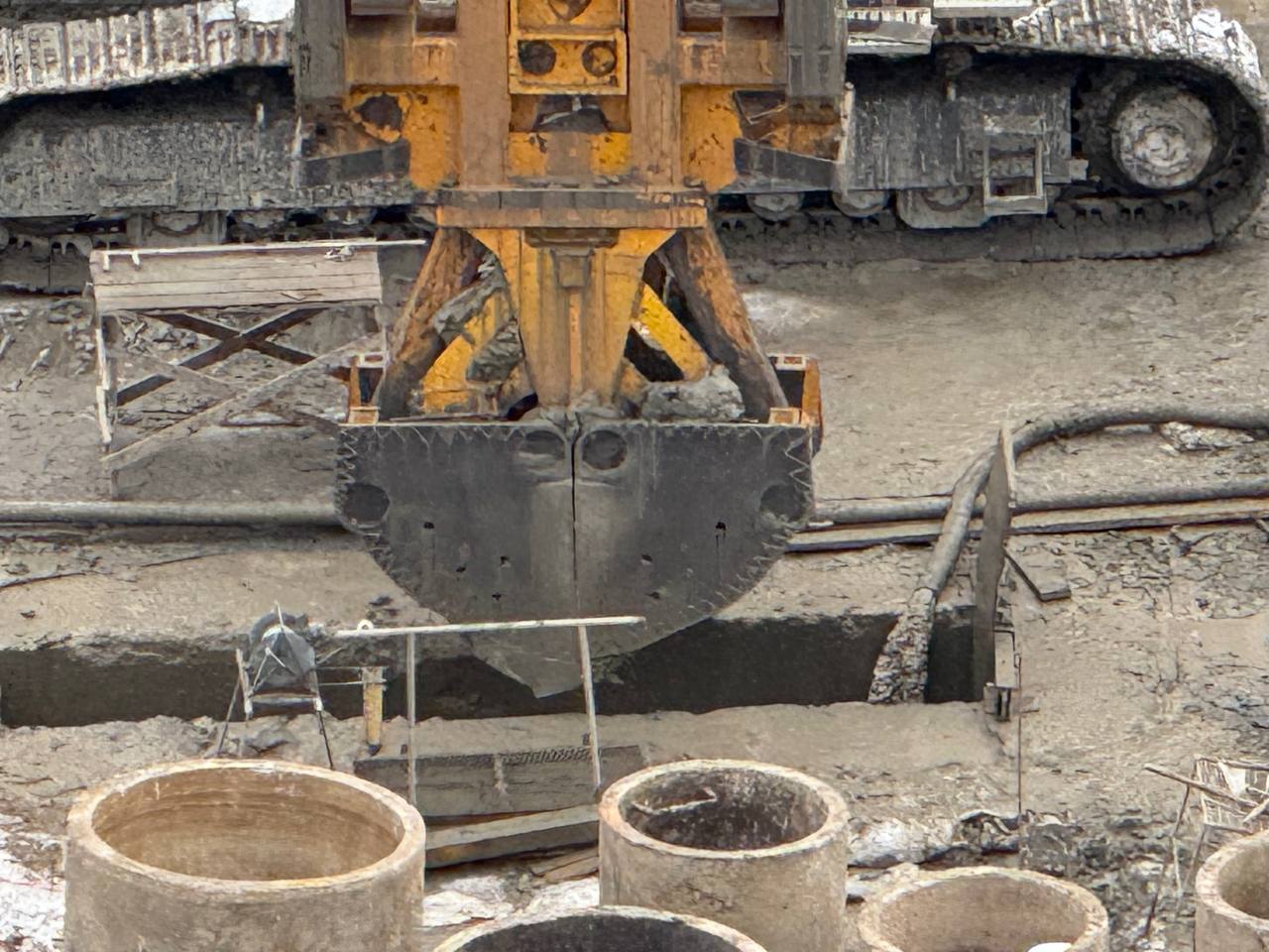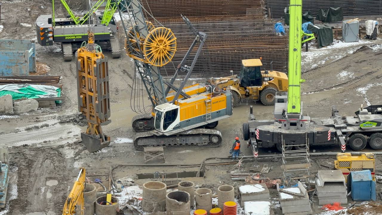 Сейчас здесь сооружают стены будущей станции метро. Сначала грейферный ковш вынимает породу, после чего ведётся армирование и бетонирование будущей стены.