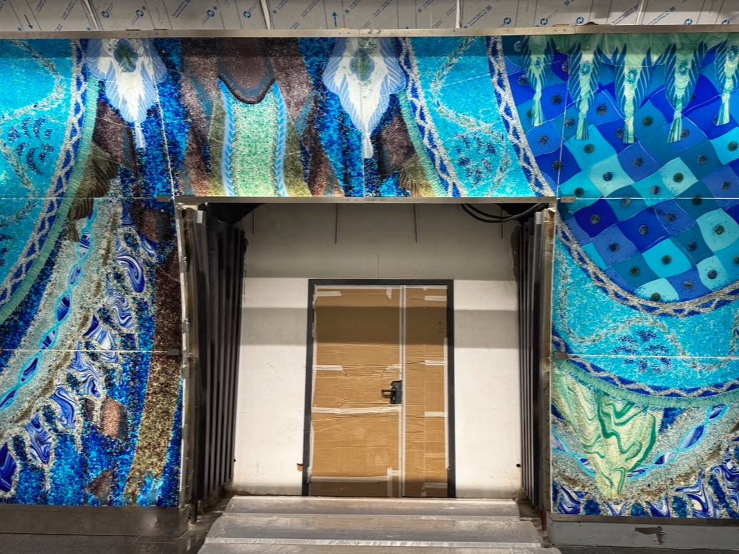 Фьюзинг - спекание/сплавление стеклянных кусочков в единое целое изделие при температуре до 1000°С. В нашем случае, с помощью техники фьюзинга, создавали стеклянные витражи оформления пассажирских проёмов.