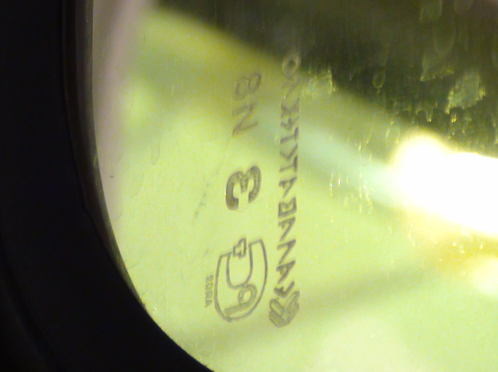 Фото сделано с последнего вагона 10020 (по направлению к Парнасу). Поезд только начал движение, и я сделал несколько снимков, сидя на торцевых сидениях, камеру держа снизу. Это клеймо на торцевой двери, внизу стекла. Камера разумеется, была ниже окна, т.к. в соседнем вагоне в торце сидел народ. Чтобы они не подумали, что я хочу снять их, я вынужден был опустить камеру. Таким образом за окном остался почти "за кадром" потолок с рампами из круглых светильников, по которым как раз и можно определить станцию, т.к. такие светильники единственные в своём роде. Я впечатлён.