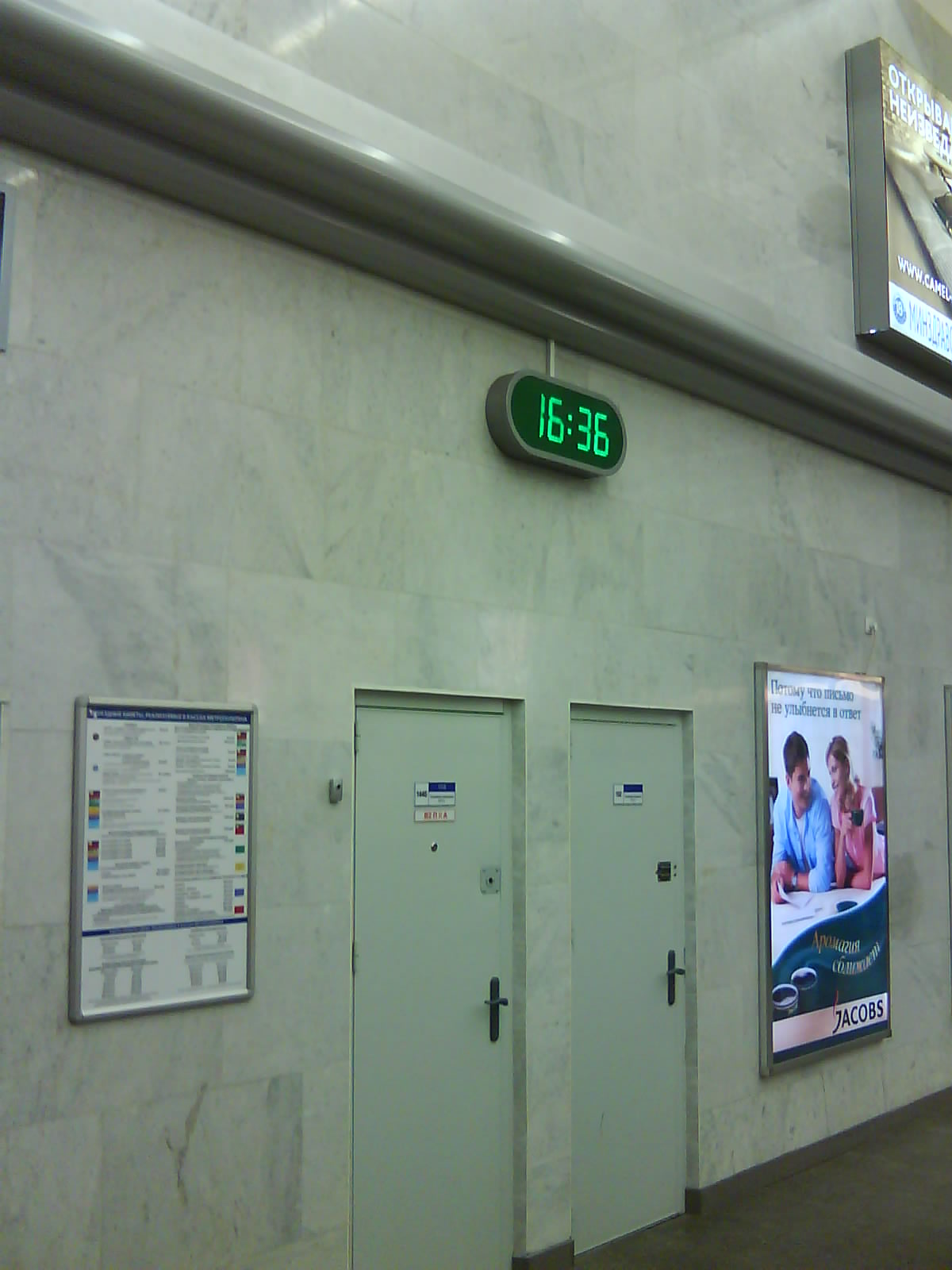Сегодня заприметил часы в вестибюле "Гостиного двора". При открытии их не было. Ходики решены с дизайнерской точки зрения в общей стилистике НИПа - корпус точь в точь как корпус лайтбокса. На мой взгляд, получилось неплохо. Часы не очень большие, но в то же время заметные, цифры чёткие. Да и цифры под цвет линии, зелёные :)