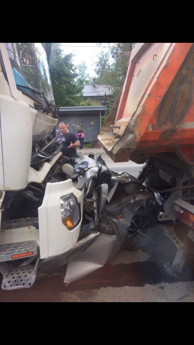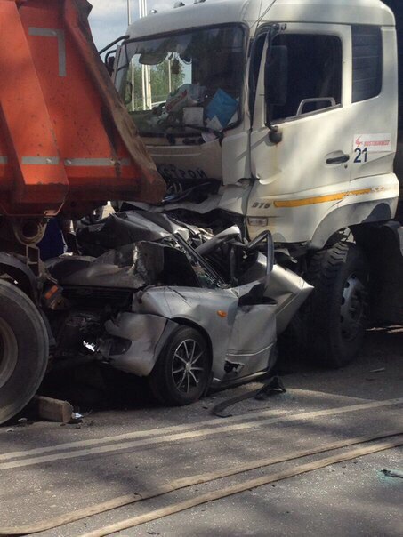 ДТП с участием камаза Метрострой, на перекрёстке в р-не Девяткино отказали тормоза, вьехал в ладу калину, видимо вёз породу на полигон.