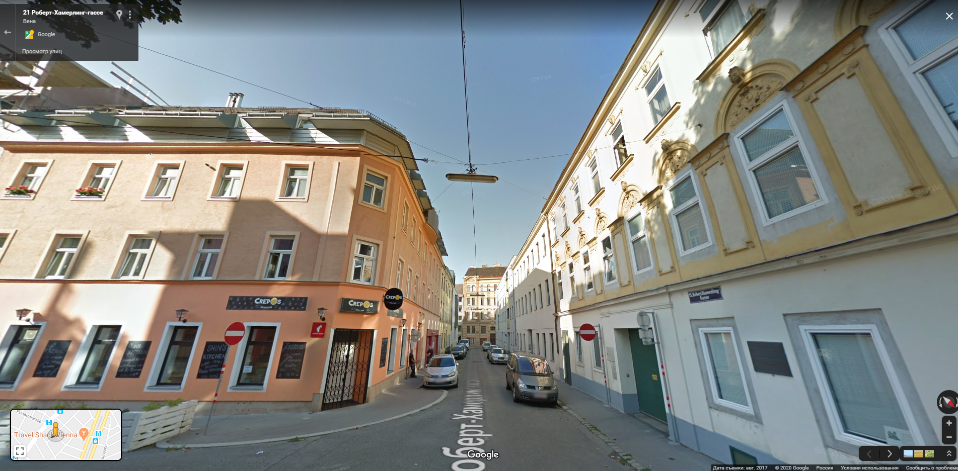 Это, конечно, здОрово, но в итоге получаем вот такие столбы прямо посередине тротуара. А если посмотреть панорамы этого же места 10-летней давности, то старые столбы стояли гораздо ближе к проезжей части и не мешали проходу.