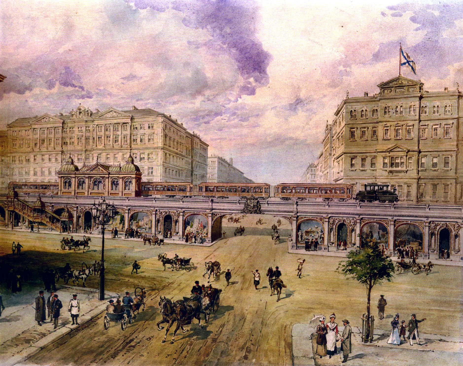 Более всего похоже на площадь Восстания, пересечение Невского с Лиговским (допустим, канал виделся засыпанным... почему-то запомнилось, что большинство дореволюционных проектов прокладки линий предусматривали задействованные каналы). Уходящая вдаль улица явно широкая, тогда как перед перекрёстком она заметно сужена. Есть один момент: тень слева. Её форма очень напоминает тень от Московского вокзала.