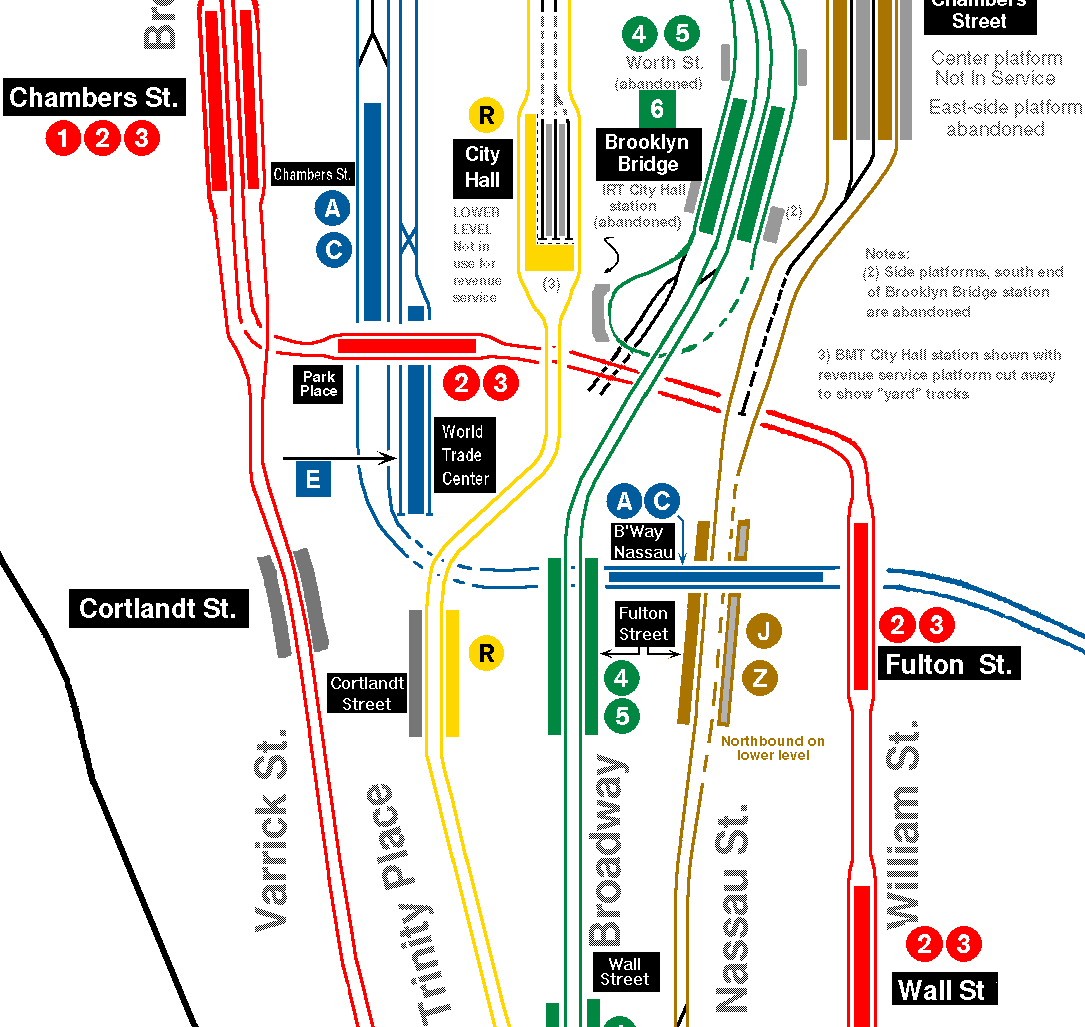 - 3 станции (IRT, BMD, IND сетей) на линиях с 4 путями: для локальных и экспрессных маршрутов. На каждой станции две островные платформы, каждая между локальным и экспрессным путем своего направления. Впрочем, третья из этих станций находится за квартал от остальных и присоединена примерно 250-метровым переходом. Также на ней был один дополнительный путь с платформой, расположенный под остальными. Среди возможных причин постройки упоминается... намеренная помеха продлению поперечной линии другого транспортного оператора. Правда, несколько лет назад продление все же было начато (транспортные операторы скуплены городом еще в 1940), и давно не использующаяся платформа была "рассечена" (?). Судя по карте, к узлу могли бы присоединить и четвертую станцию, еще одной четырехпутной линии, распложенную даже ближе третьей, но, видимо, либо это не требуется ввиду наличия других пересадок, либо технически сложно. Ну, или просто деньги не хотят тратить.