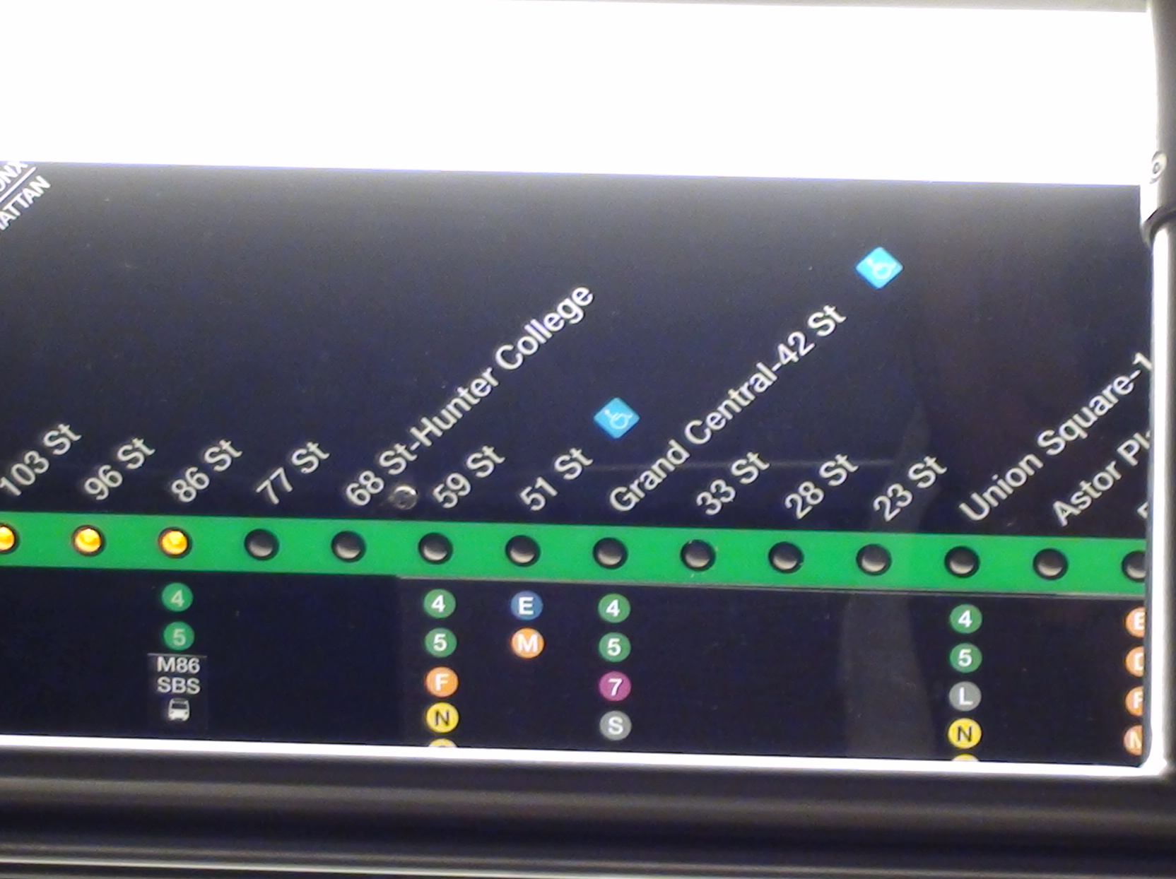 Есть более курьёзные места. Например, перехода с линии Lexington с 59 St на станцию Lexington Avenue – 63rd Street линии Sixth Ave нету. Хотя, на маршрутнике внутри вагонов она обозначена (см. фото). При прибытии на станцию из информатора идёт следующая речь: "A free transfer is also available to the F train by walking over to the Lexington Avenue - 63 Street Station and using your MetroCard". Что в переводе означает "Также, доступна бесплатная пересадка на Ф трейн, для этого пройдите по Лексингтон Авеню на 63 Стрит, и используйте вашу МетроКард". Вообще, это мягко говоря не пересадка для тех, у кого только разовая карта. По сути это не пересадка в нашем понимании. Просто станция по близости