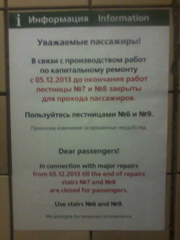 В понедельник объявление о ремонте перевесили с угла у 7 лестницы на стену напротив 6 лестницы. При этом объявление, скажем так, немного потеряло "товарный вид" и стало еще менее заметным.
