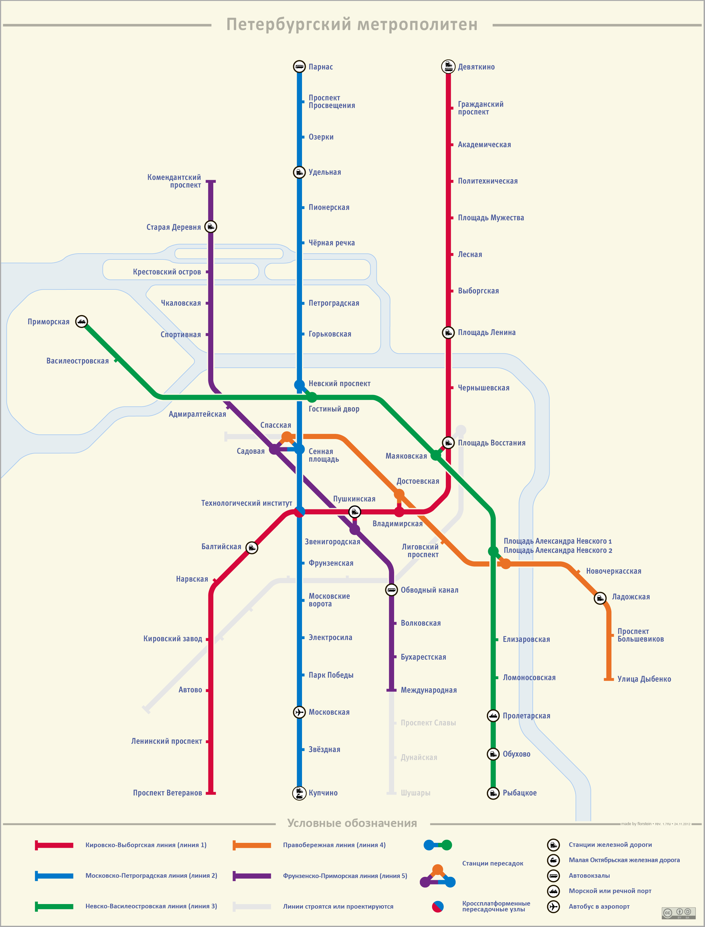 Всё-же на схеме метро было бы не лишним обозначить как идут линии Ж/Д с пригородным сообщением, а также всё-же приблизить схему к масштабам и реальным пропорциям размещения станций на городской территории. Например по карте метро совершенно не очевидно, что от пл. Ленина до Удельной 10 мин. на электричке, что Ланская недалеко от Чёрной речки и Лесной, Ленинский пр. ж/д - в 15 мин. пешком от метро или две остановки на троллейбусе/автобусе и т.п.