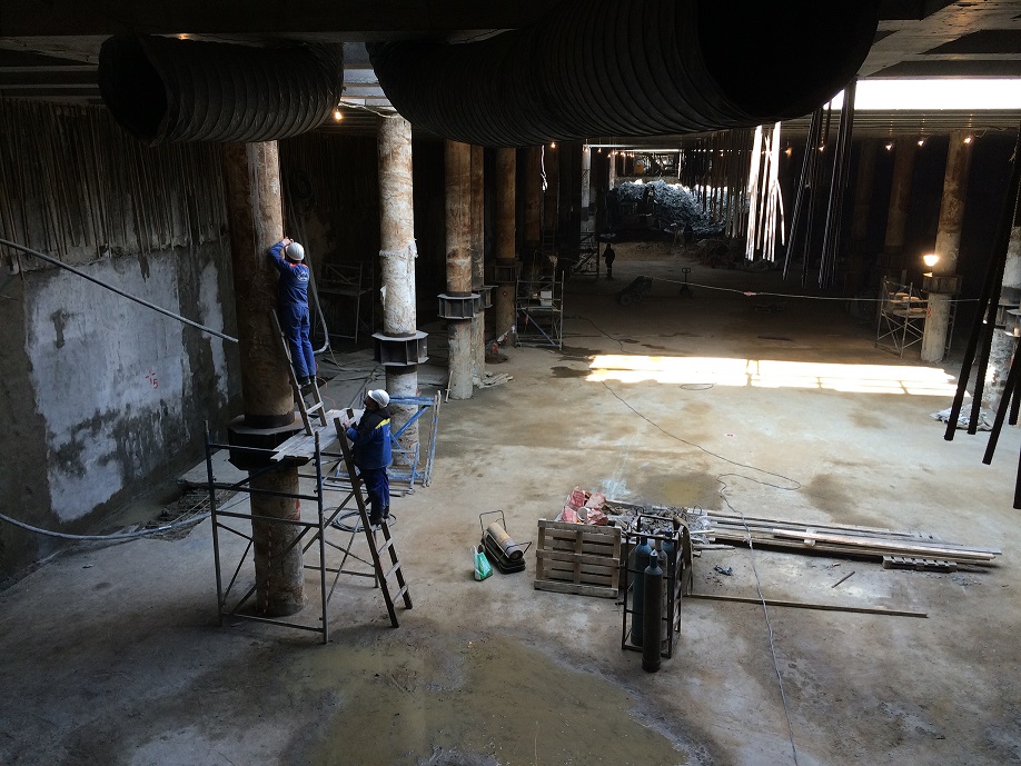 Плита, которая служит сейчас нижним перекрытием, будет вырубаться. А постоянная плита первого уровня будет выше, там где бочонки сейчас на колоннах.