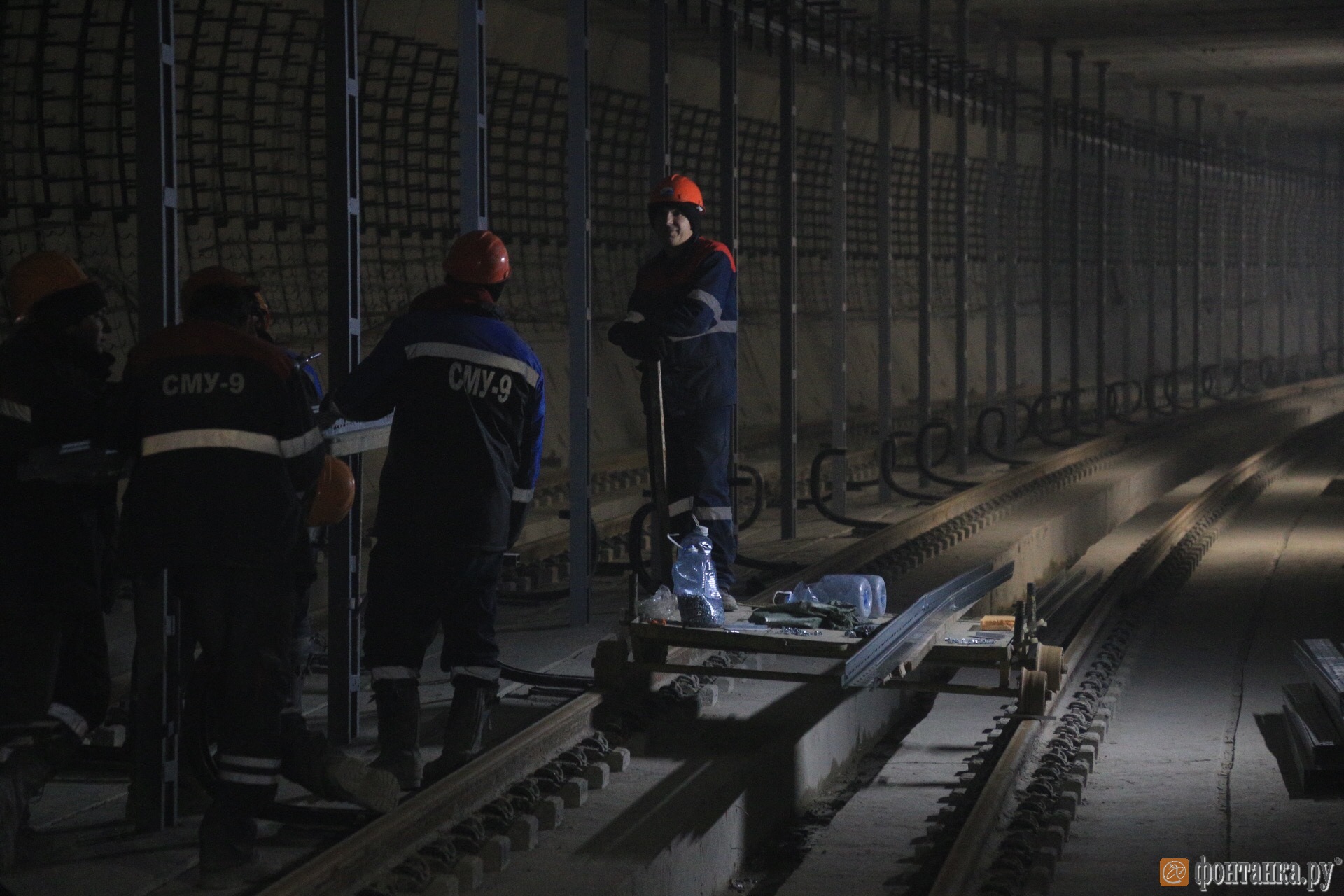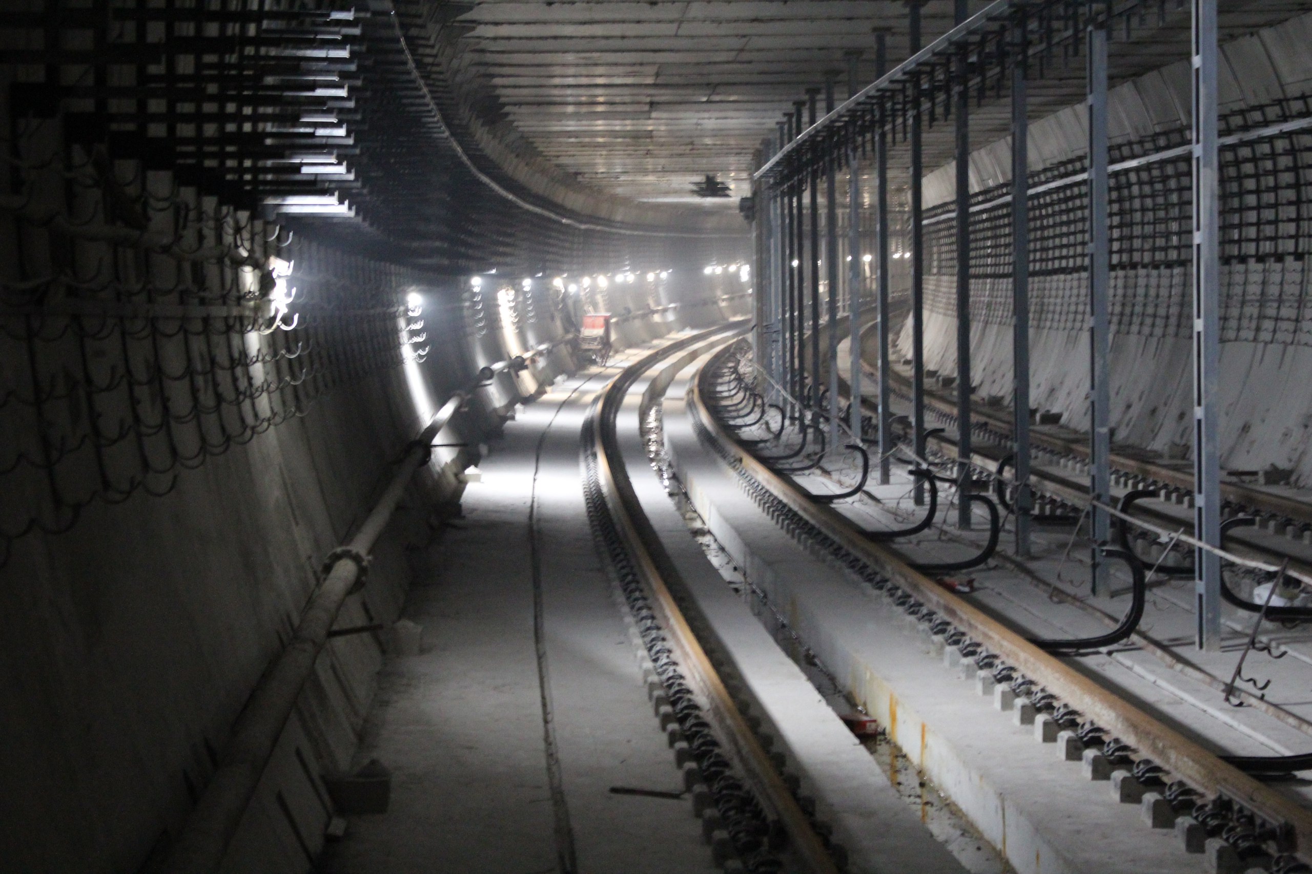 Сейчас рабочие сооружают основание для платформ. Будет двухпутная железная дорога. В тоннеле, проходящим под Финским заливом - это его прорыл проходческий щит «Надежда», уже уложили пять километров рельсов в обе стороны.