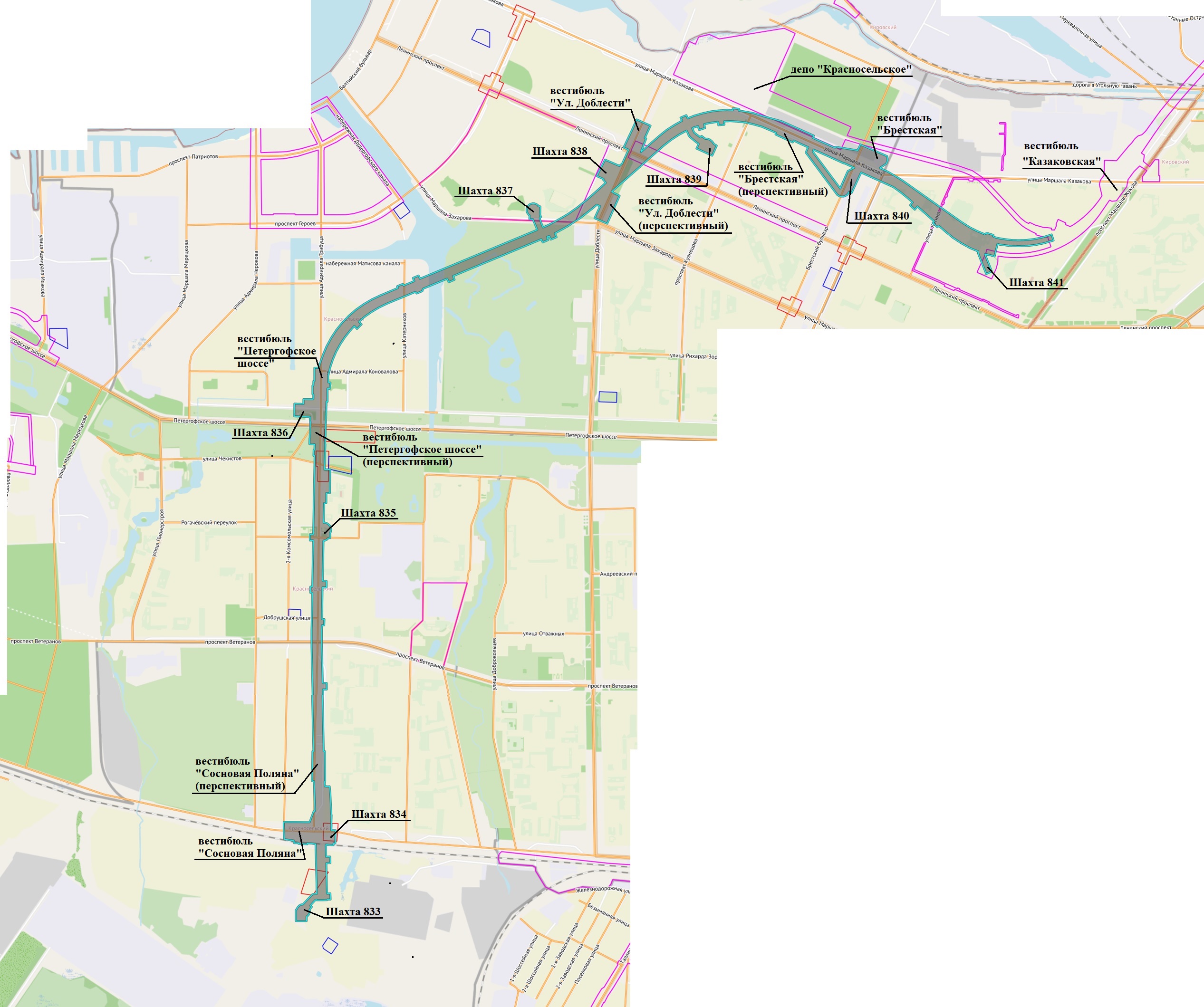 По указанному участку действует распоряжение КГА от 23.09.2019 г. № 1-11-293 "О подготовке документации по планировке территории для размещения линейного объекта "Красносельско-Калининская линия метрополитена от станции "Казаковская" до станции "Сосновая Поляна" и заключен государственный контракт от 26.04.2018 г. № ПМ-6/2018 с ООО «НИИПРИИ «Севзапинжтехнология» на выполнение работ по подготовке документации по планировке территории. Срок подготовки документации по распоряжению КГА - 20.03.2021 г., срок по контракту - истек 26.06.2019 г. Доп. соглашения, в связи с "выходом в свет" нового распоряжения КГА, нет. Также, по этому участку в 2018 году АО "Метрогипротранс" завершено выполнение государственного контракта от 13.10.2016 г. № ПМ-23/2016 на выполнение предпроектных работ. С использованием материалов указанного предпроекта на схему ППТ нанес планируемые места размещения вестибюлей и шахт (нумерация шахт взята "от обратного" с учетом имеющейся 841).