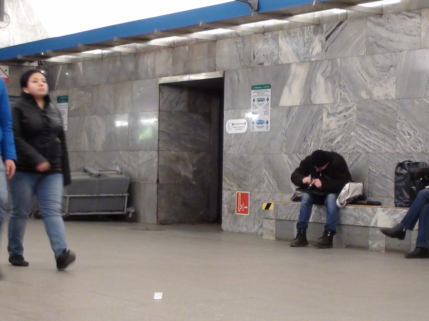 На МЧСовских инфососах в центре зала установили по два экрана, теперь гонят там всякую мультяшную рекламу о том, как правильно ездить в метро. Также в середине станции появилась синяя загородка, написано, что временный склад службы Э.