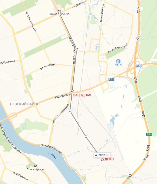 Совместив карты РГИС и схему из задания на ППТ в Лен. области получается такая общая схема участка от станции "Улица Дыбенко" до станции "Кудрово" с электродепо "Правобережное":