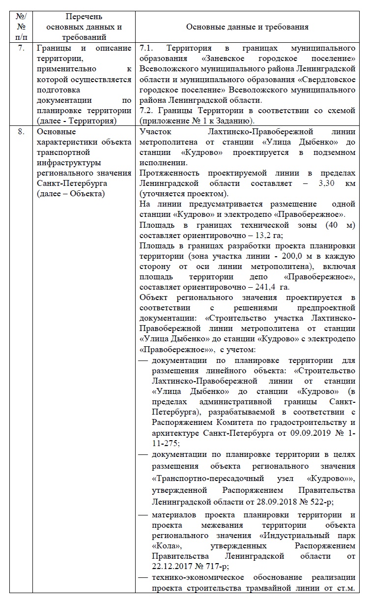Григорий78 писал(а):АНО «Дирекция по развитию транспортной системы Санкт-Петербурга и Ленинградской области» разместило закупку на подготовку проекта планировки территории и проекта межевания «оранжевой» линии метрополитена от станции «Улица Дыбенко» до станции «Кудрово» с электродепо «Правобережное». Стоимость работ составляет 30,5 млн рублей. Согласно условиям контракта, документацию необходимо подготовить к апрелю 2021 года.