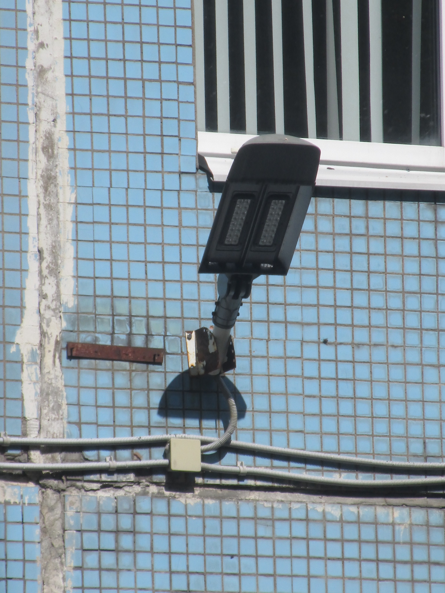 Ещё один минус бетонных, что они сделаны только под одну штангу. И как вы все видите штанга эта стоит неправильно, висит сбоку, а не вставлена в верхушку. Но во многих местах нужно два, три светильника, и в разных положениях, а придумать кронштейн на две, три штанги для бетонного столба так и не смогли. В космос летали, кольскую сверхглубокую бурили, а кронштейн универсальный не смогли или забили.