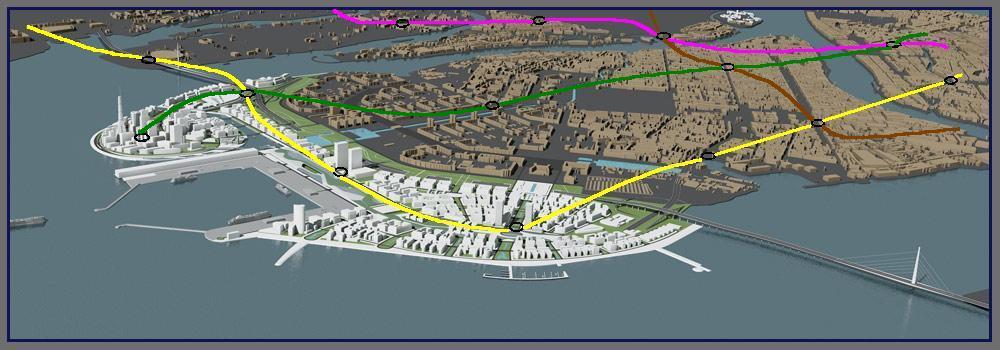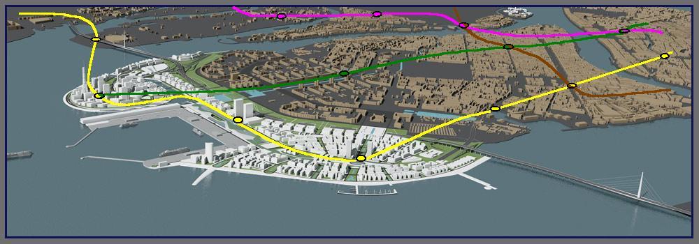 Синия линия, это что за фантазия? И куда и откуда идёт? НВЛ на север гнать не рекомендую, так как там уже ЗЗЛ и ФПЛ, куда НВЛ пихать собираетесь? По этой схеме можно только сделать угол западнее Приморской, пересадку между НВЛ и ЗЗЛ (там где сейчас остров заканчивается), плюс добавочную станцию НВЛ ещё западнее (уже на намыве).