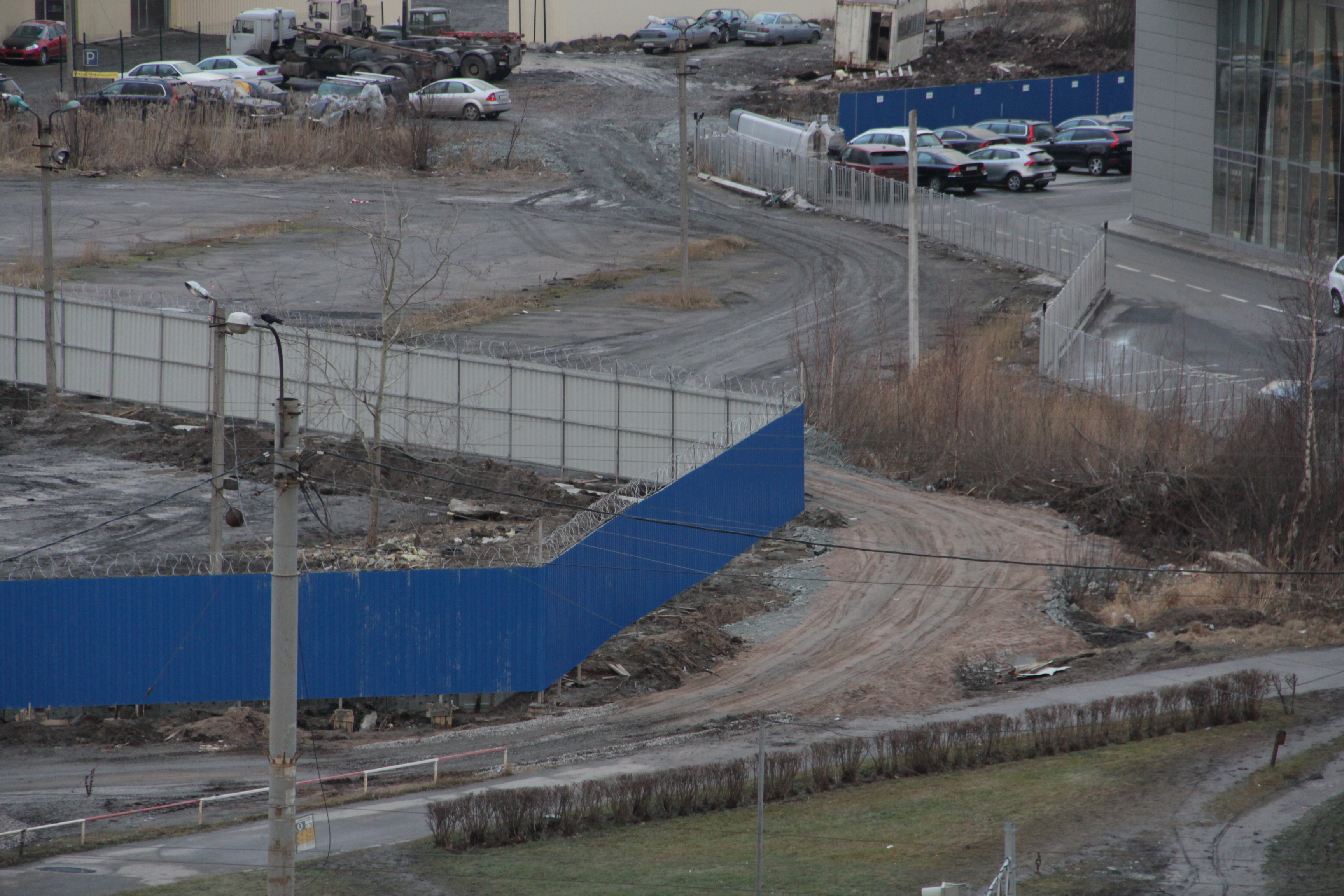 Очередные фотографии с объекта - периметр стройплощадки почти полностью замкнут, продолжается и близится к завершению укладка плит. Восточнее забора сооружена временная объездная(вместо находившейся ранее на территории площадки) дорога для подъезда к автосервису и другим организациям, расположенным позади территории площадки