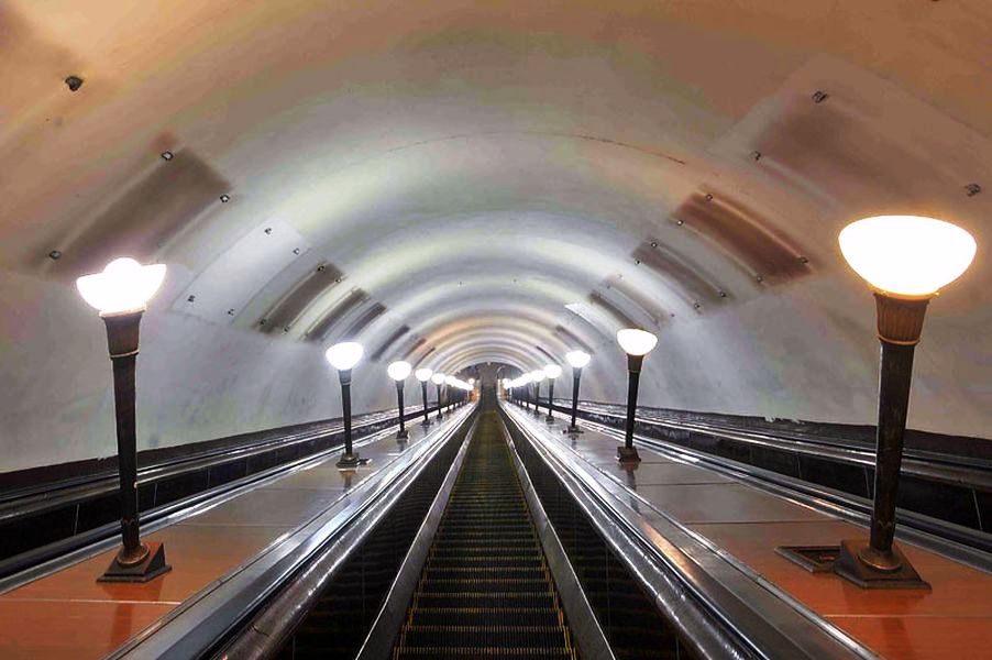К сожалению, не нашел фото оригинальных эскалаторных светильников "Владимирской", но вот фото, найденное на просторах Сети, с аналогичными светильниками на одной из московских станций метро: