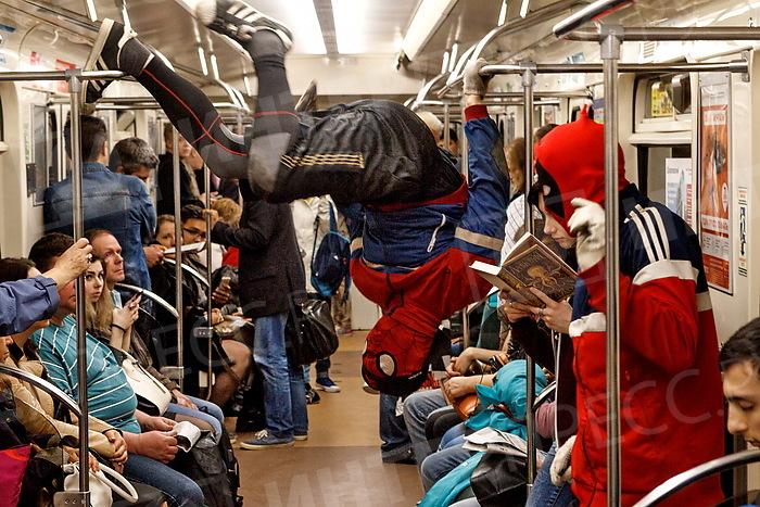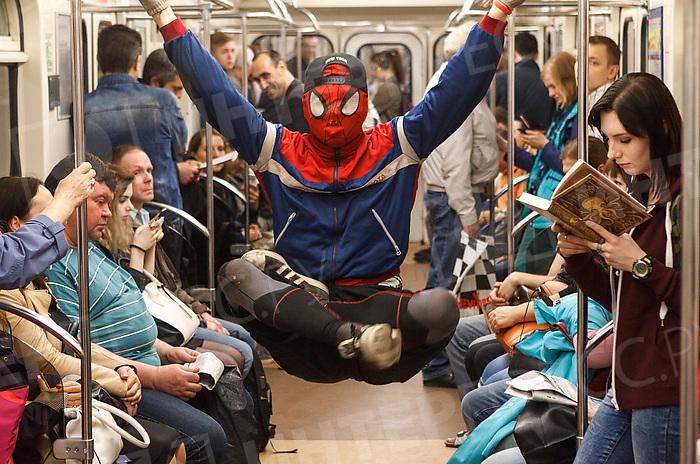 05-07-2017 Пассажиры в костюмах Человека-паука и Дэдпула выступают в вагоне Санкт-Петербургского метрополитена. Фото: Роман Пименов