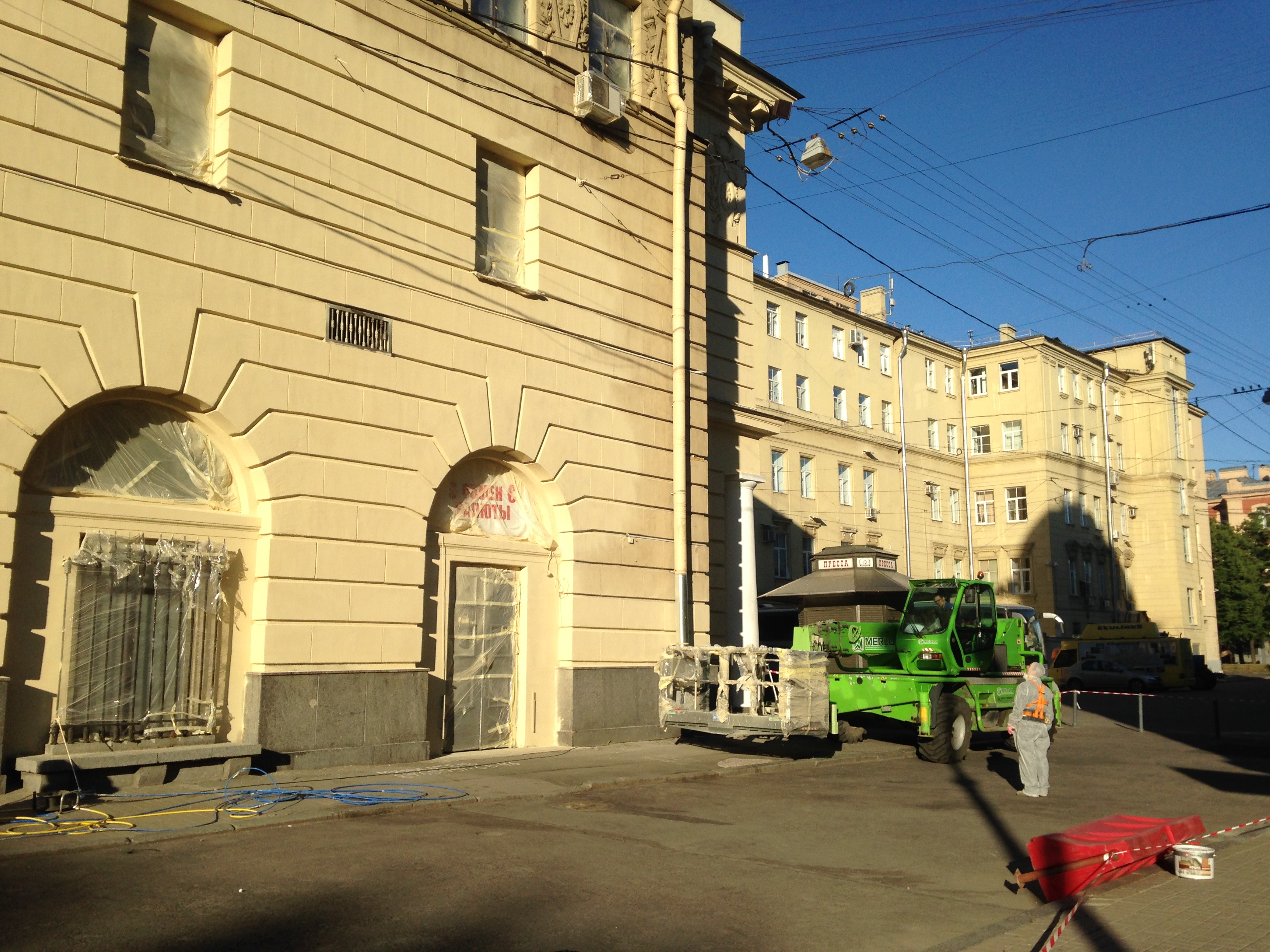Демонтируют забор, вернули фонари, заменили остекление вестибюля. Фото сегодняшние.