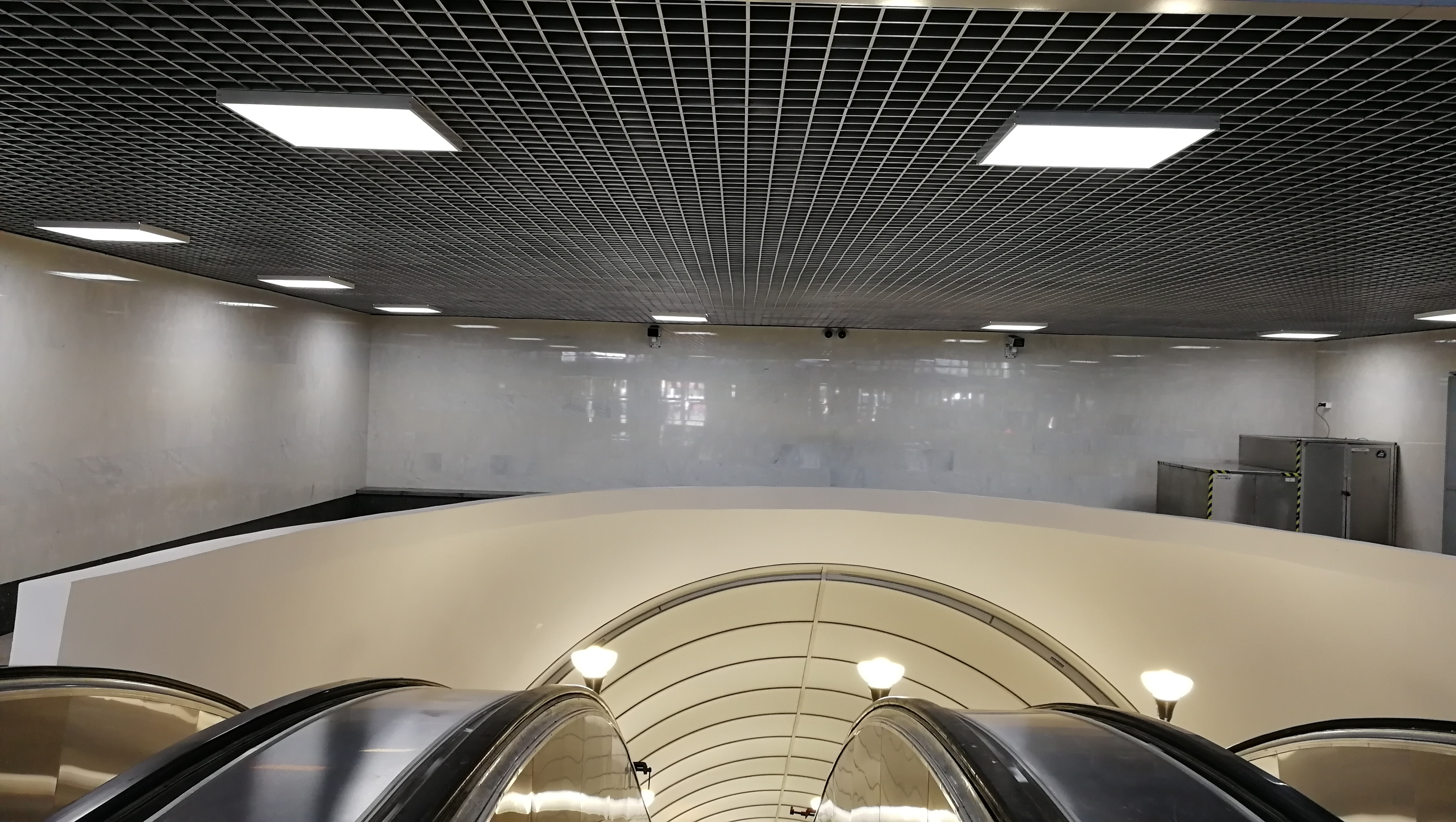 Изначально потолок в вестибюле был как на заводе, затем - как в офисе, теперь же он как в торговом центре: