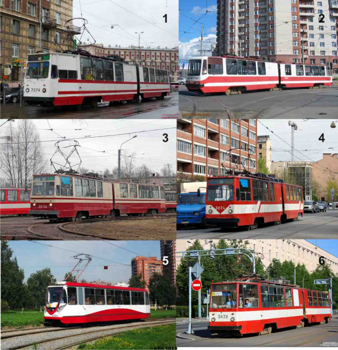 самая "старая" это №1, в такую цветовую схему красилось большинство вагонов ТП-7, только полосы были не Красными, а голубыми или синими. По факту - первая попытка стандартизировать окраску СПб трамвая, когда было предписано, что все трамваи должны быть красно-белыми, 7-й парк сохранил схему, но поменял цвет. №2 появилась примерно одновременно с №1, красили в неё ТП-3, иногда ТП-5 и ЛМ68М СТТП. 4 - так называемая "Лиговская" схема окраски вагонов, вторая попытка стандартизировать окраску. №6, как правильно замечено, упрощённый вариант №4, парковым малярам. №5 - "расово-верная" дизайнерская окраска "пчёл", они все должны были быть такими, но распоряжении о применении "Лиговской" схемы её похерило.