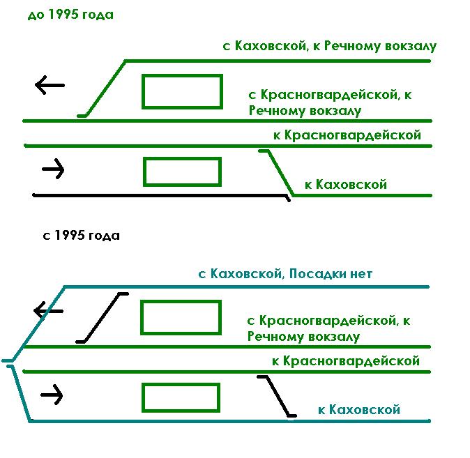 Спасибо за столь быстрый ответ! Теперь я припоминаю, что аналогичную схему узла Каширской мне приходилось видеть. И, моё мнение - это не шедевр удобства при вилке. Куда логичнее было бы развести поезда, отправляющиеся на Каховскую и Красногвардейскую по разным путям/платформам. В этой ситуации пассажиром было бы проще ориентироваться (вовремя можно заметить, что поезд пришёл не на тот путь), да и нагрузка на платформу была бы более равномерной.
