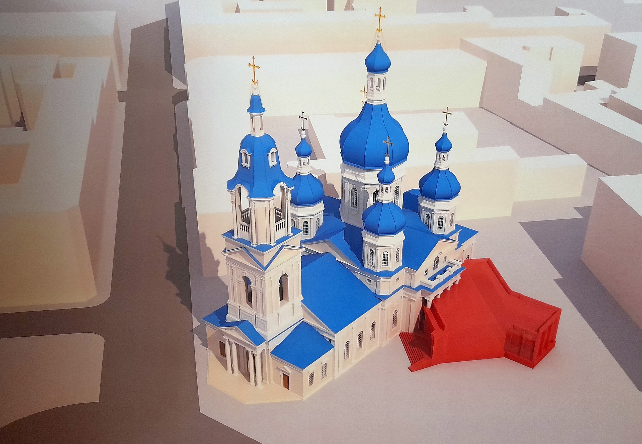 Можно и все три строения обьединить в одно: два вестибюля и храм. Получилось бы уникальное в своём роде сооружение: выход из-под земли прямо в церковь.