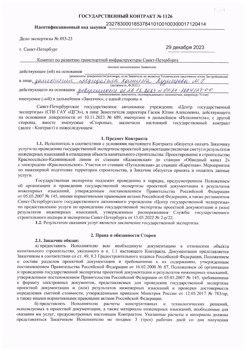 29.12.2023 г. КРТИ заключен государственный контракт № 1126 с СПБ ГАУ "ЦЕНТР ГОСУДАРСТВЕННОЙ ЭКСПЕРТИЗЫ" на оказание услуг по проведению государственной экспертизы проектной документации (включая смету) и результатов инженерных изысканий в отношении объекта капитального строительства: Проектирование и строительство Красносельско-Калининской линии от станции "Казаковская" до станции "Обводный канал 2" с электродепо "Красносельское". Участок от станции "Путиловская" до станции "Каретная". Мероприятия по инженерной подготовке территории строительства для нужд Санкт-Петербурга.