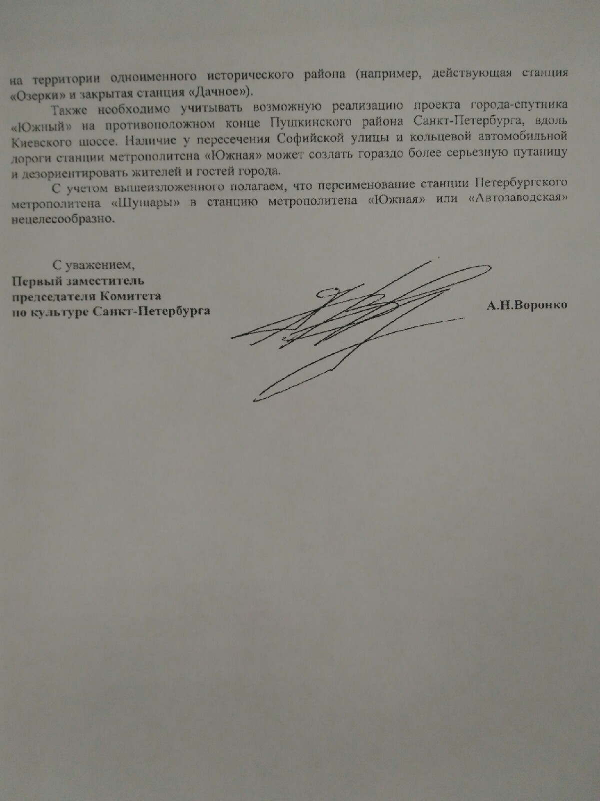 Ответ из Комитета по Культуре, о нелогичности переименование станции: