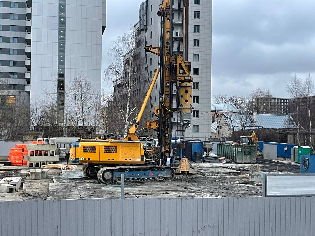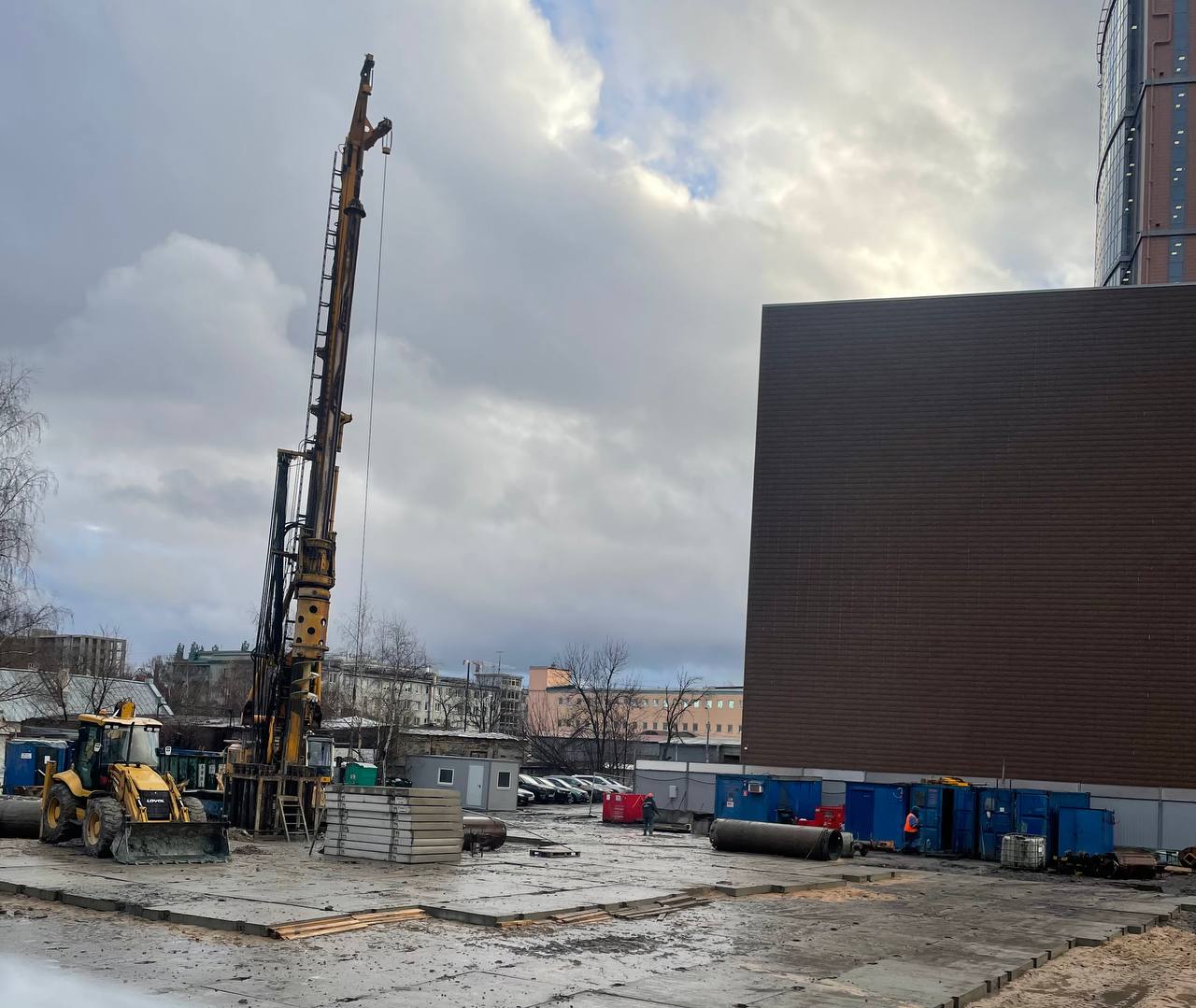 Продолжается работы по сооружению водонепроницаемой стенки из буросекущих свай. Возведено примерно 75% стенки. В будущем именно в рамках этой конструкции будет выработан грунт для шахты метро.