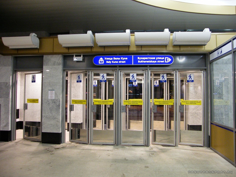источникЕщё одни интересные двери были на станциях, открытых в 90-е, а именно: "Спортивная", "Чкаловская", "Крестовский остров", "Старая Деревня". ИМХО, это были лучшие двери в ПМ с функциональной точки зрения – лёгкие, плавные, с доводчиками. Увы, не так давно их все заменили на современные: