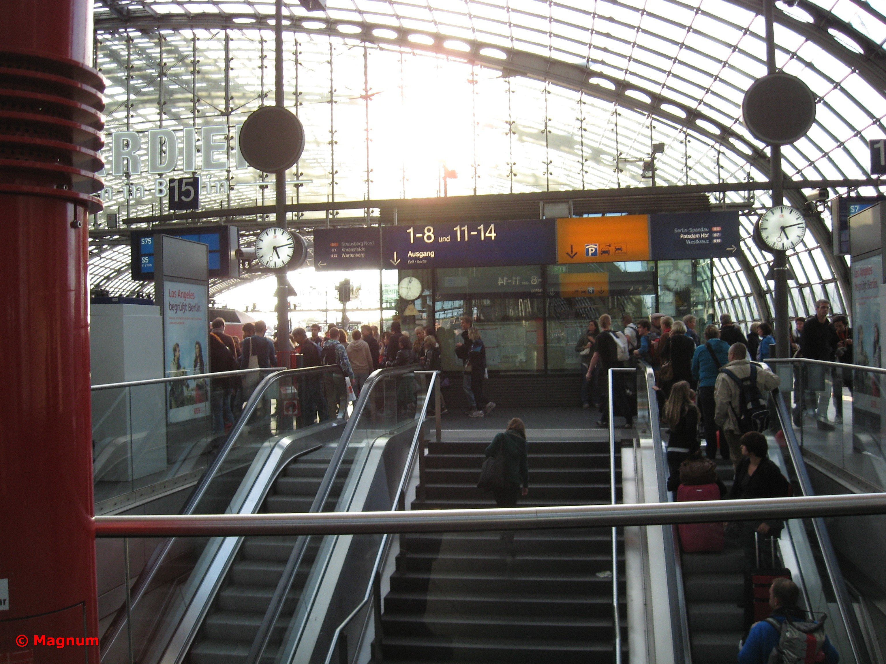 На платформе вокзала Berlin Hauptbahnhof. Эскалаторы и лестницы для передвижения между уровнями