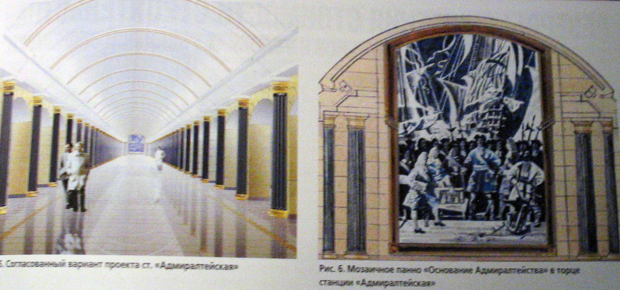Вариант Адмиралтейской со стеклянным потолком из журнала "МиТ" #6-2006. Я так понял, что за стеклом должны располагаться лампы освещения. Получился бы неплохой светящийся потолок, типа того, что был в свое время на Кировском Заводе (точнее не потолок, а световые окна). Жаль, в стекло у нас деньги никто вкладывать не будет...:(
